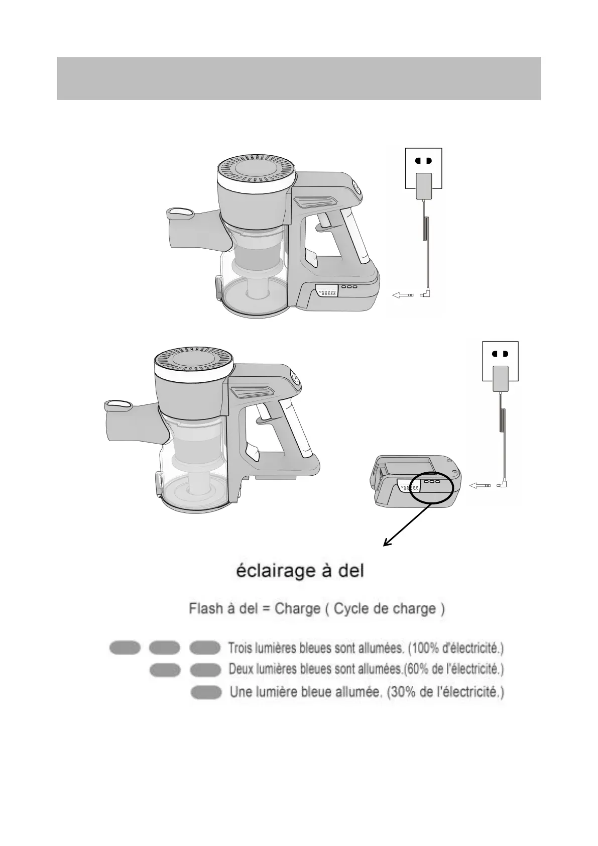Branchez et chargez l'unité jusqu'à ce que les trois voyants LED bleus soient