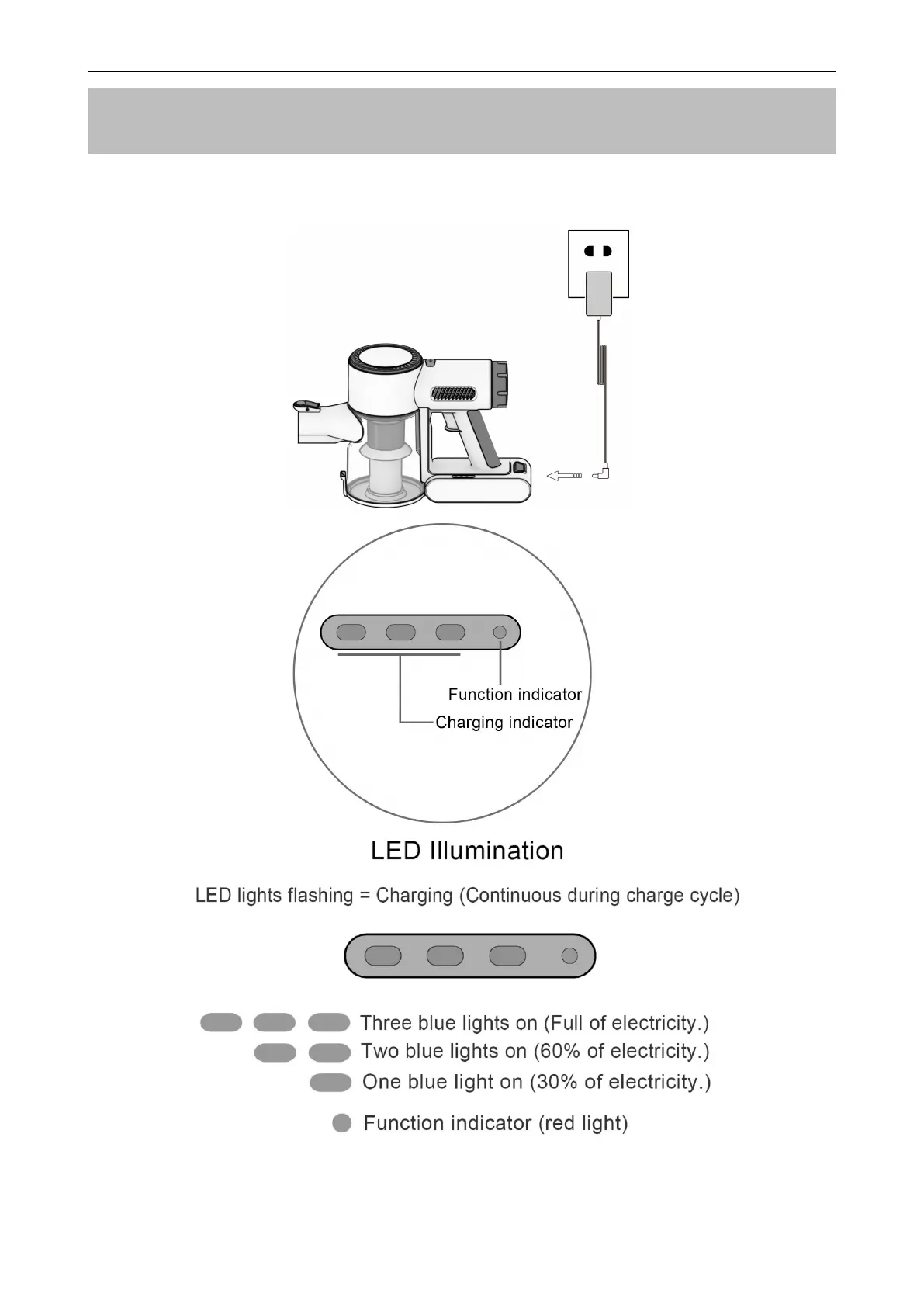 Plug in and charge the unit, until all three blue LED lights are always on.