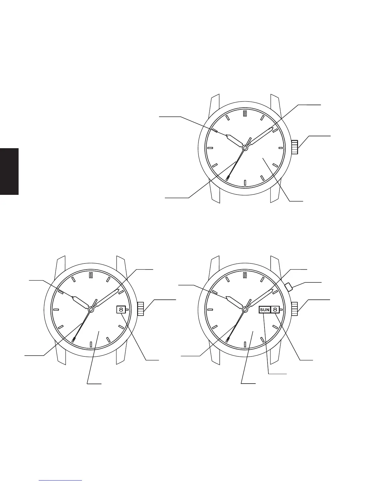 * La ubicación de la corona, del indicador de fecha o de la ventana del día de