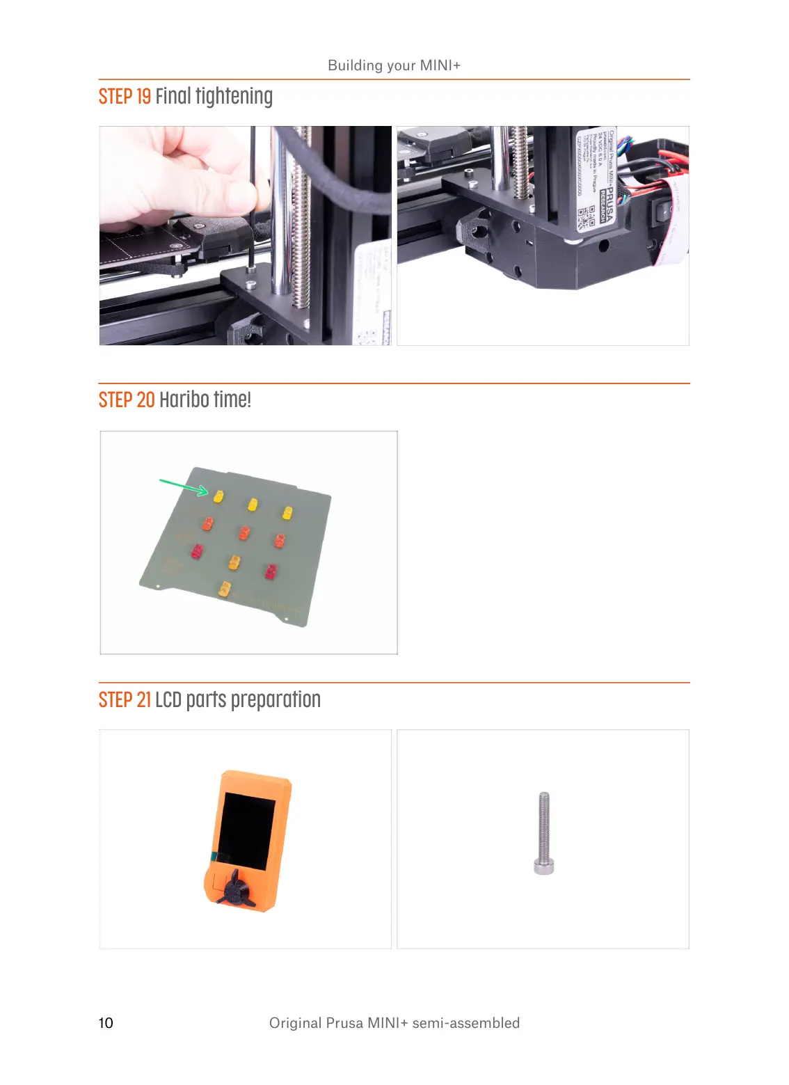 Original Prusa MINI+ - Step 19 Final tightening; Step 20 Haribo time!; Step 21 LCD parts preparation