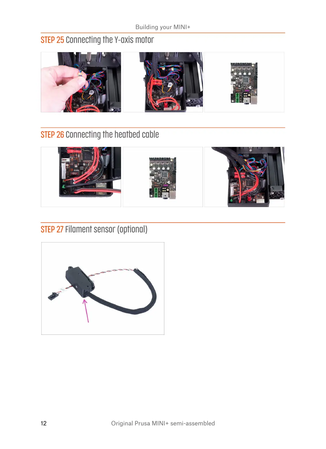 Original Prusa MINI+ - Step 25 Connecting the Y-axis motor; Step 26 Connecting the heatbed cable; Step 27 Filament sensor (optional)