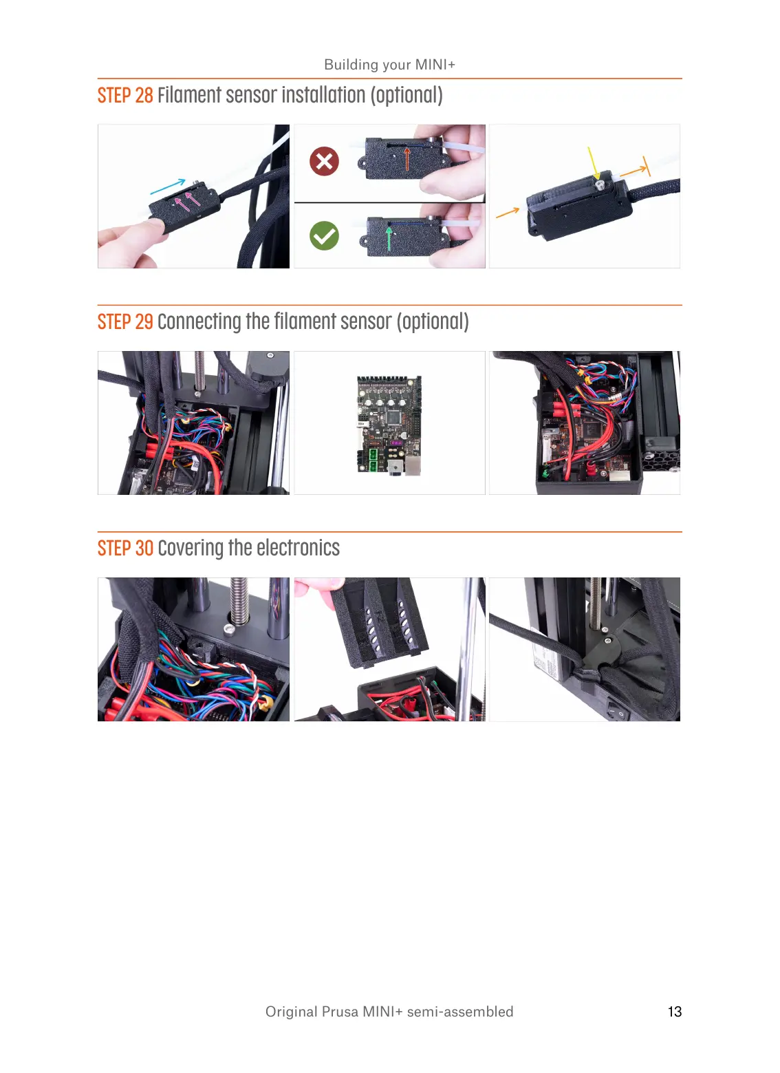 Original Prusa MINI+ - Step 28 Filament sensor installation (optional); Step 29 Connecting the filament sensor (optional); Step 30 Covering the electronics