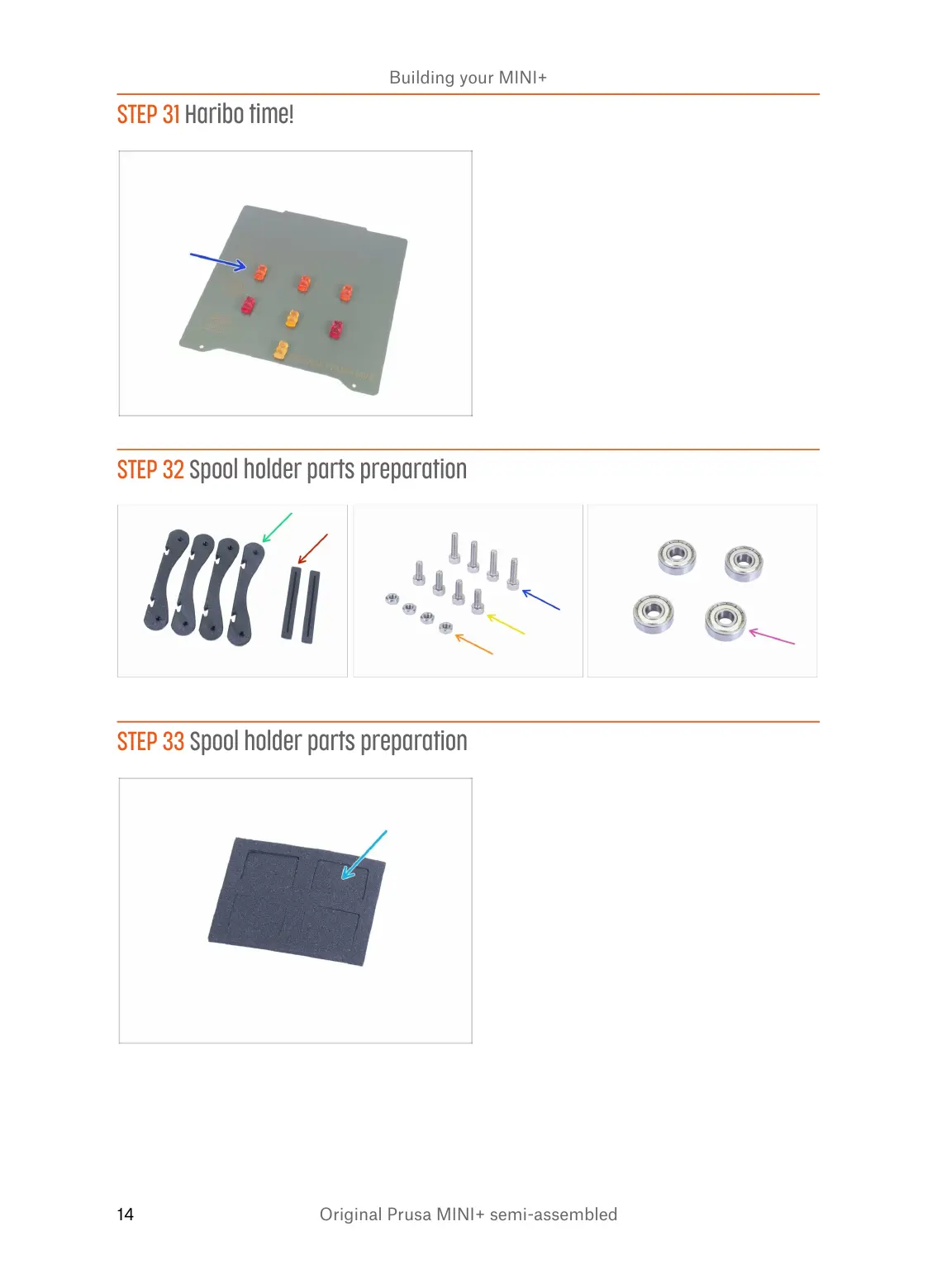 Original Prusa MINI+ - Step 31 Haribo time!; Step 32 Spool holder parts preparation; Step 33 Spool holder parts preparation