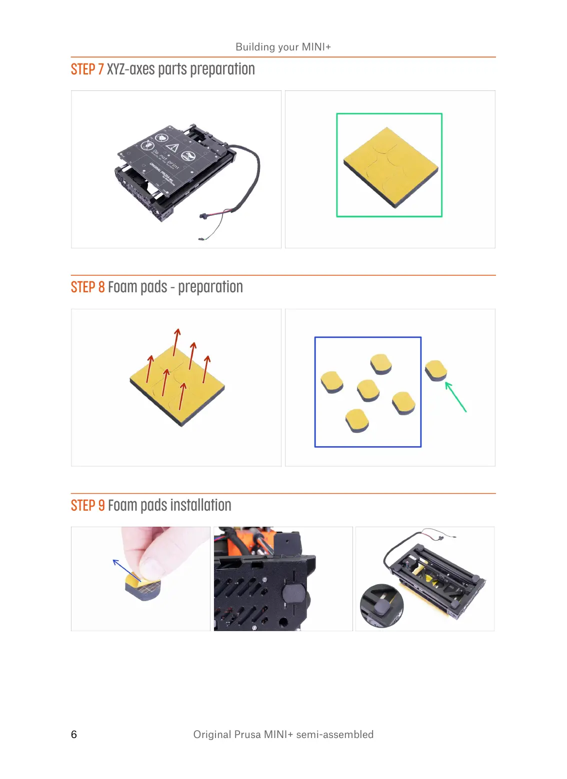 Original Prusa MINI+ - Step 7 XYZ-axes parts preparation; Step 8 Foam pads - preparation; Step 9 Foam pads installation