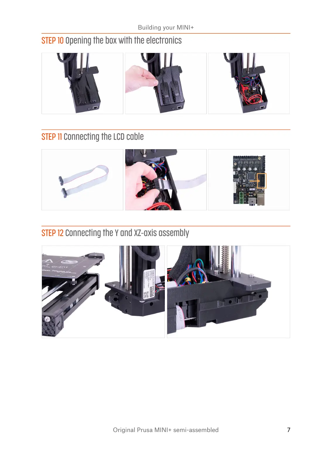 Original Prusa MINI+ - Step 10 Opening the box with the electronics; Step 11 Connecting the LCD cable; Step 12 Connecting the Y and XZ-axis assembly