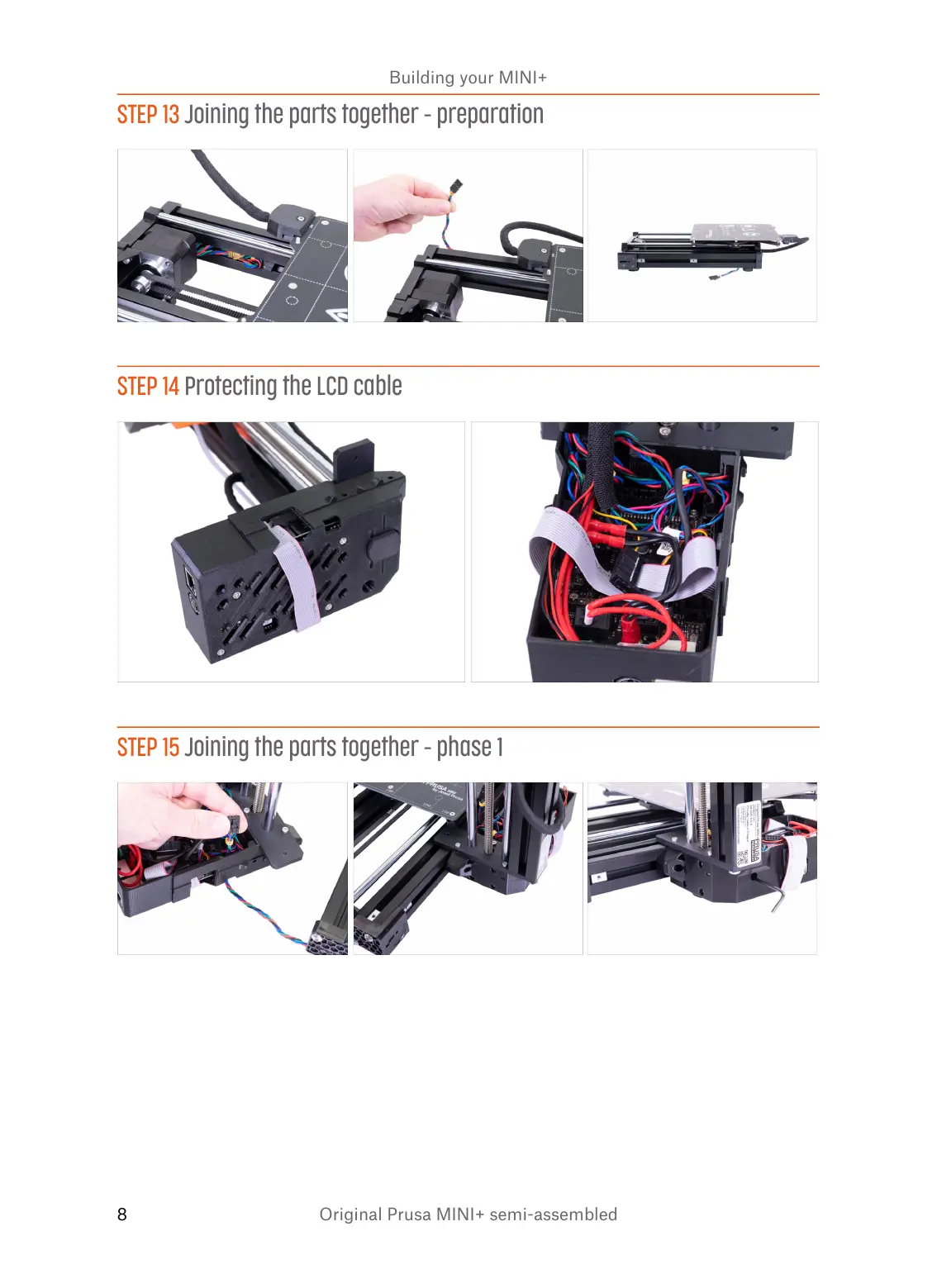 Original Prusa MINI+ - Step 13 Joining the parts together - preparation; Step 14 Protecting the LCD cable; Step 15 Joining the parts together - phase 1