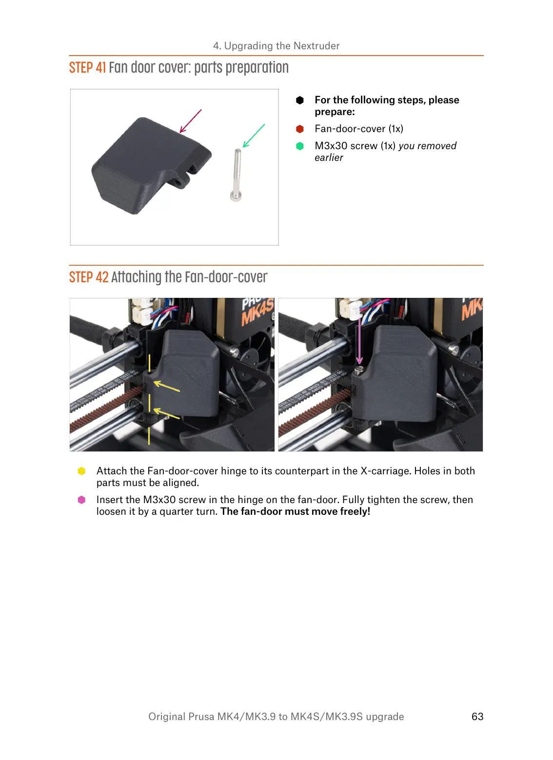 Insert the M3x30 screw in the hinge on the fan-door. Fully tighten the screw, then