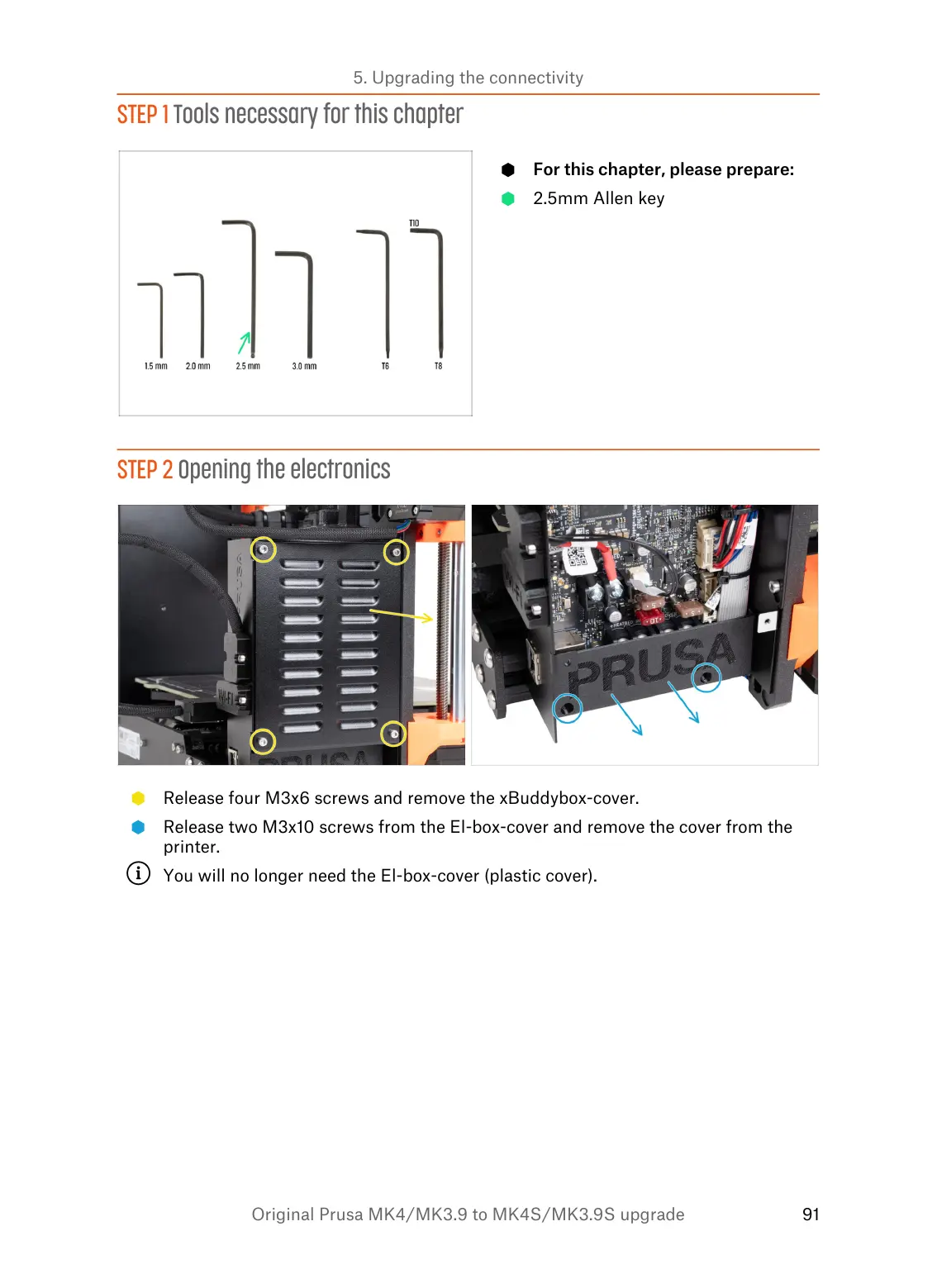 Release two M3x10 screws from the El-box-cover and remove the cover from the
