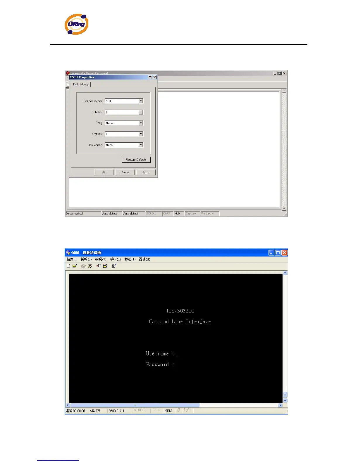 (4) The COM port properties setting, 9600 for Bits per second, 8 for Data bits, None for Parity,