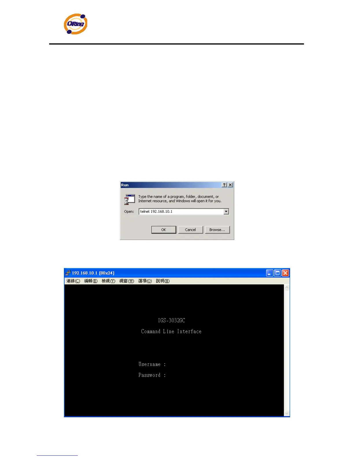 (1) Telnet to the IP address of the switch from the Windows “Run“ command (or from the