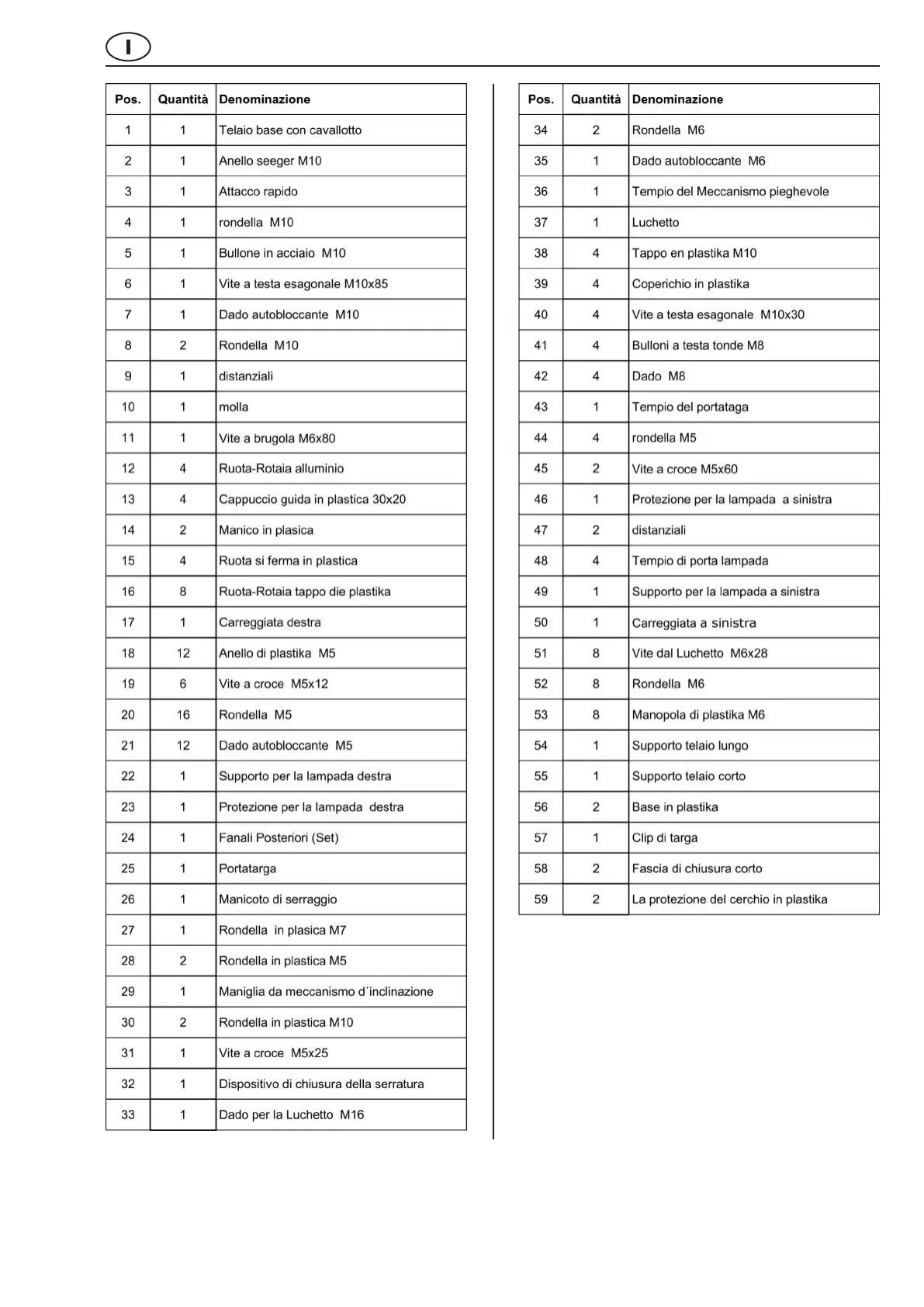 Panoramica dei pezzi di ricambio - tabella