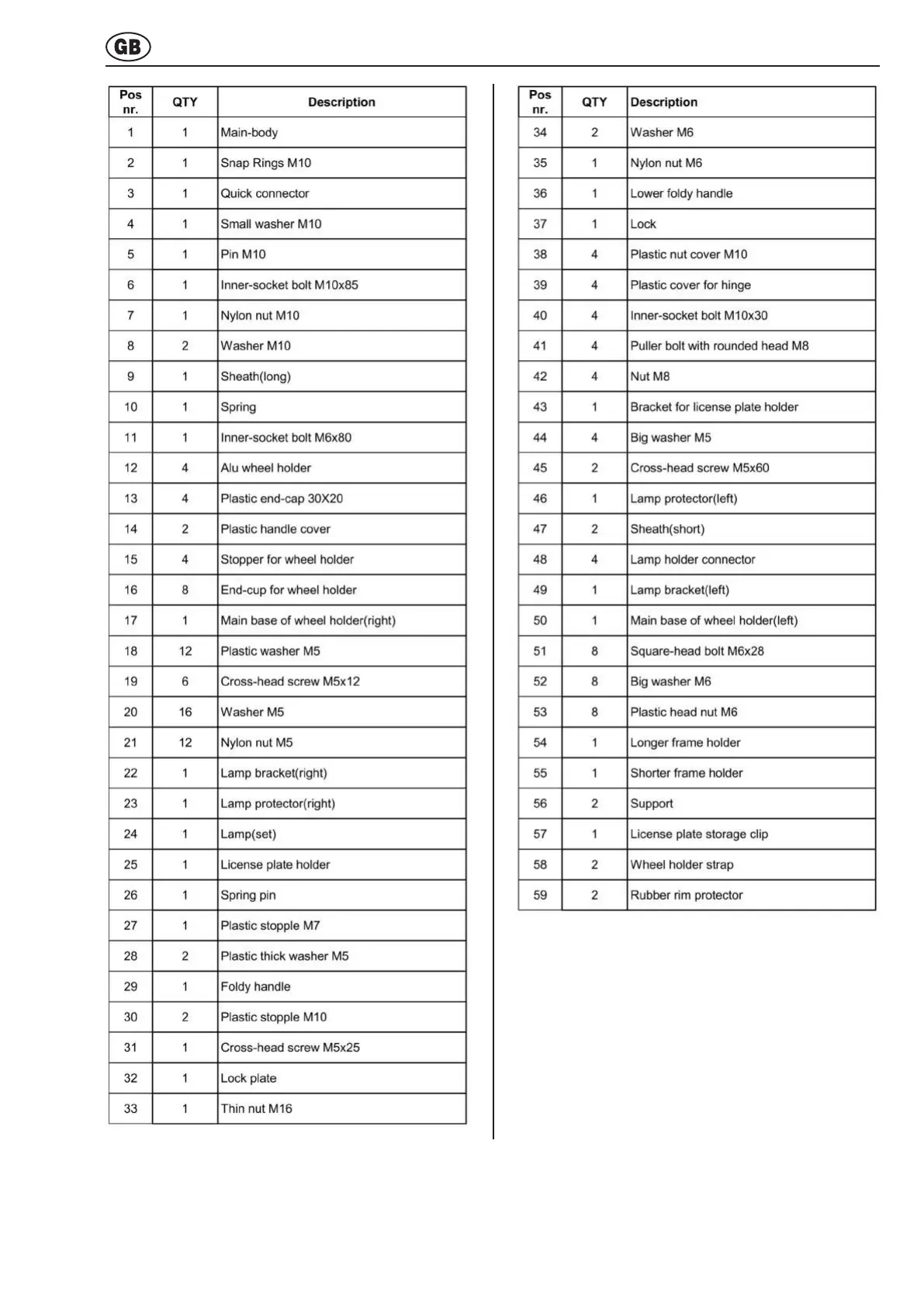Oris Tourer - Parts List Table
