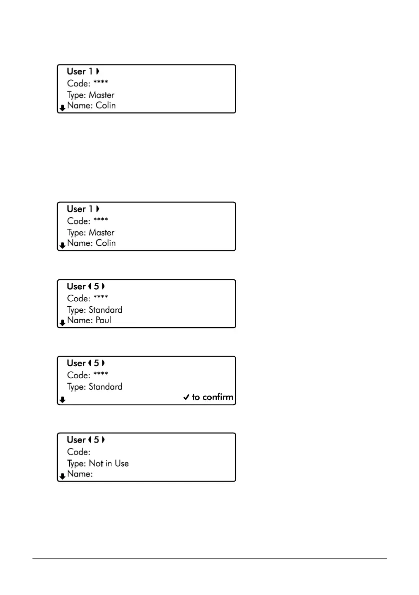 2. Use the L/ o and R/ r keys to select the user to be deleted, e.g., User 5:
