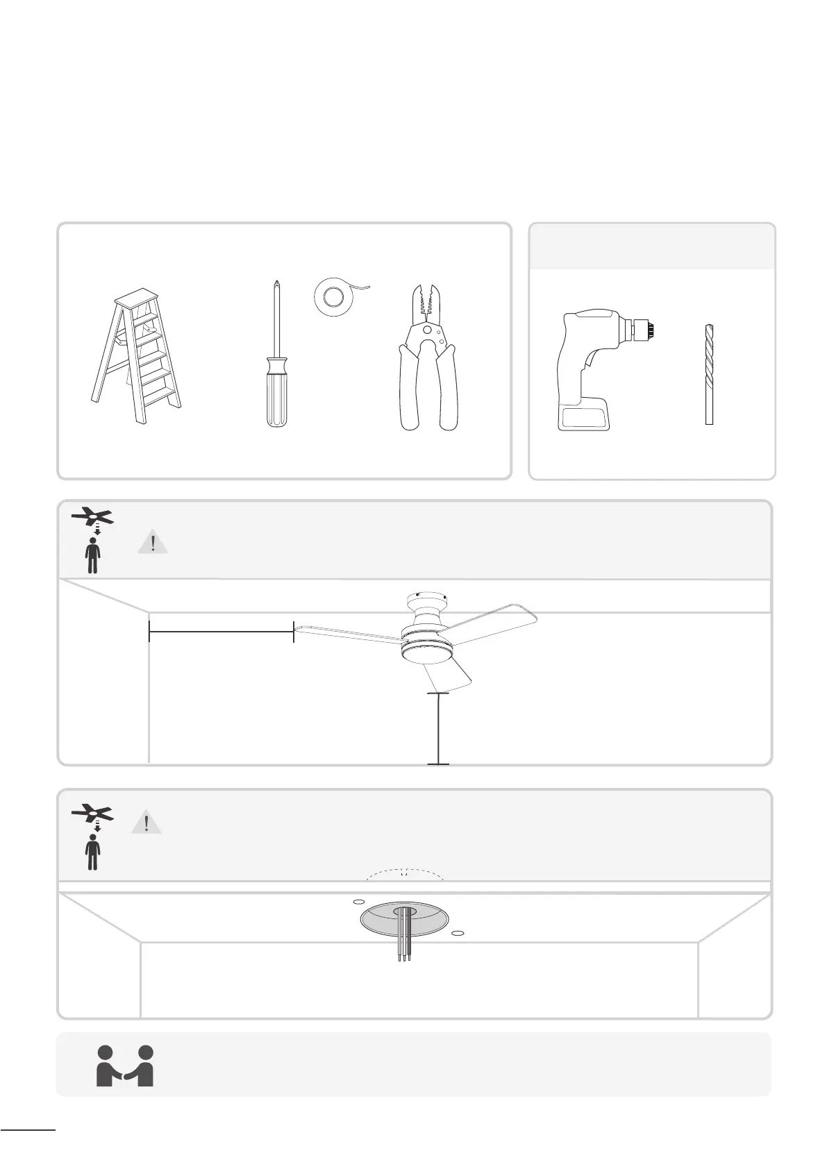 It is recommended to have a patner when installing the ceiling fan.