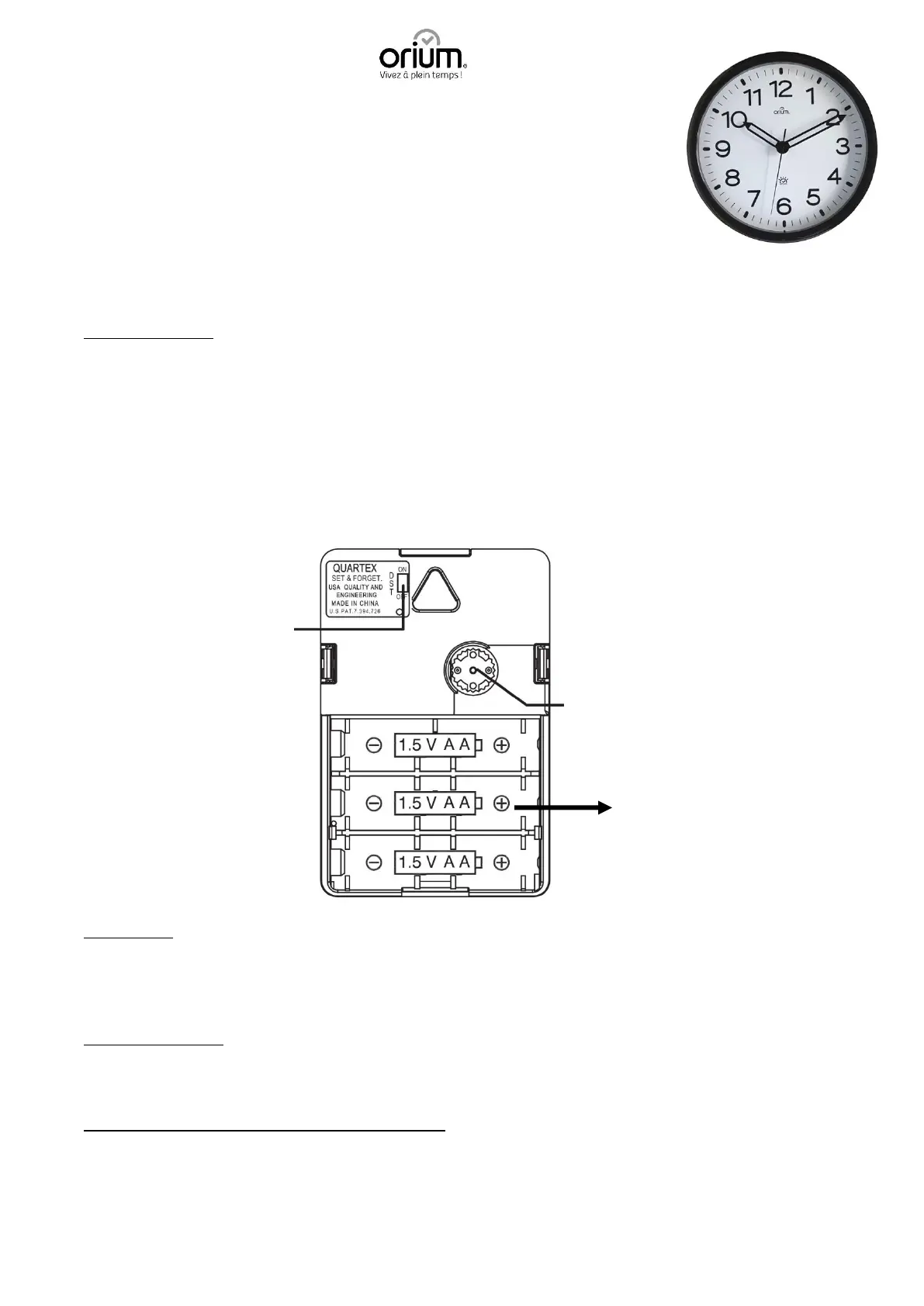Instalar las 3 pilas LR6 (no incluidas) en el mecanismo por la parte posterior del reloj, en el