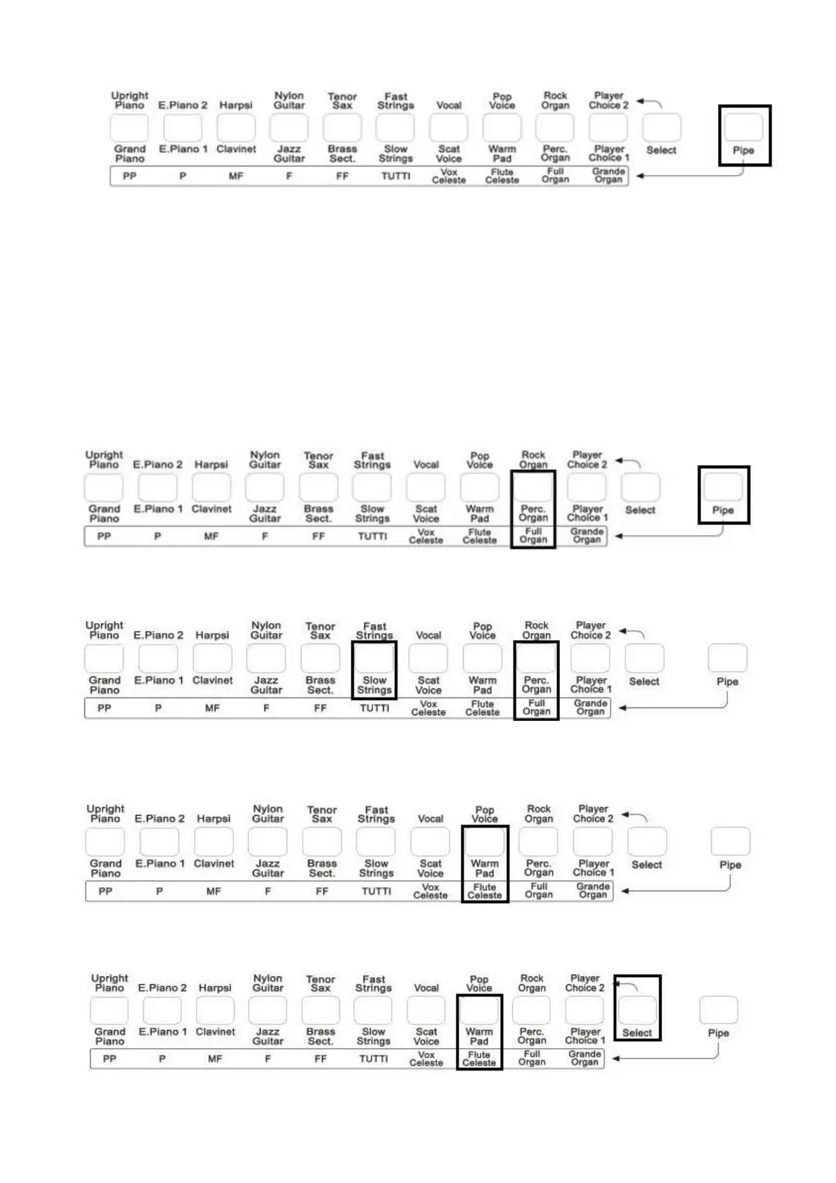 Per selezionare i suoni di Organo a Canne, è necessario premere il pulsante PIPE alla destra della