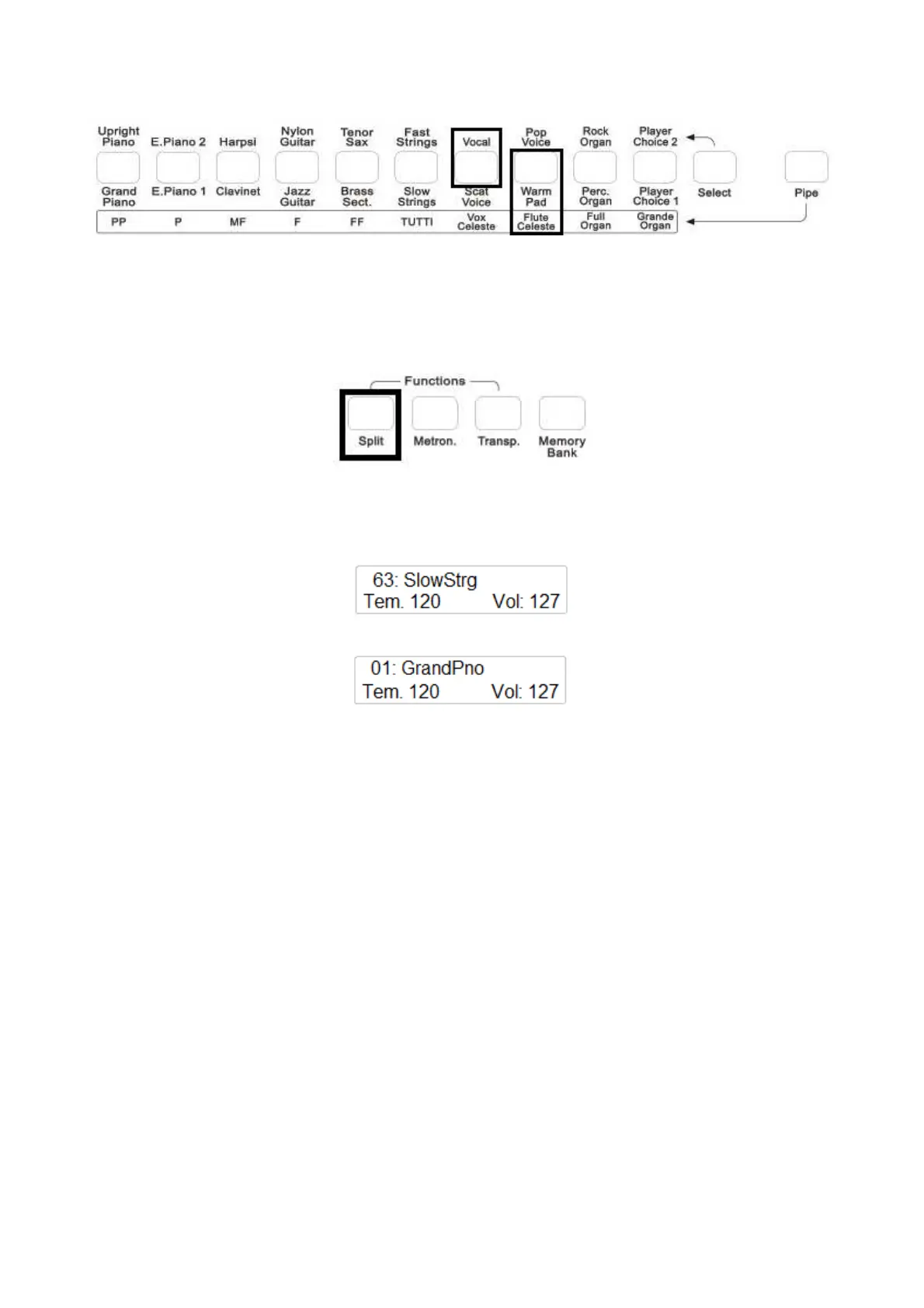 Utilizzando i pulsanti Player Choice 1 e 2 è possibile selezionare uno qualsiasi dei 142 suoni