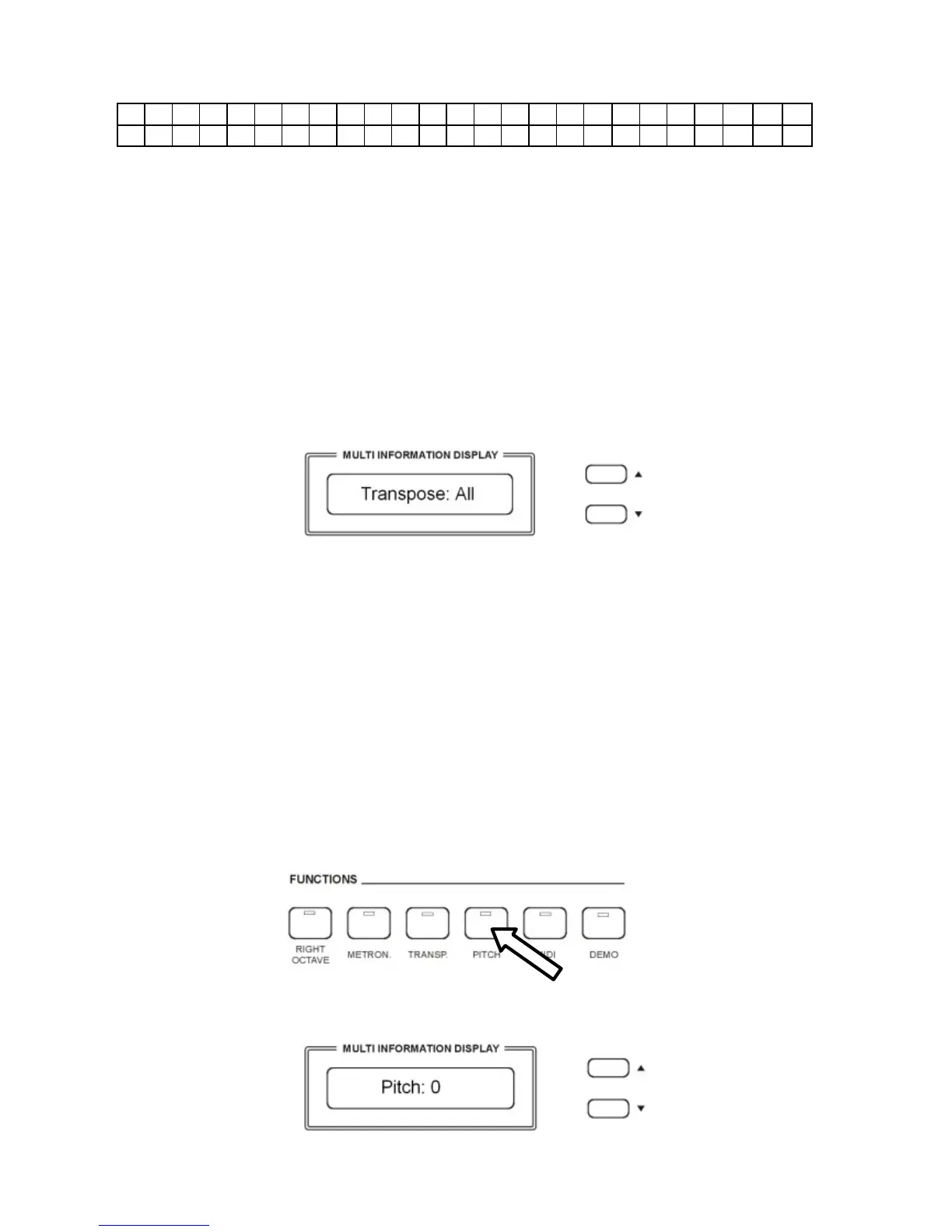 Premere il pulsante TRANPOSE per alcuni secondi ed il display indichera’ i settaggi disponibili.