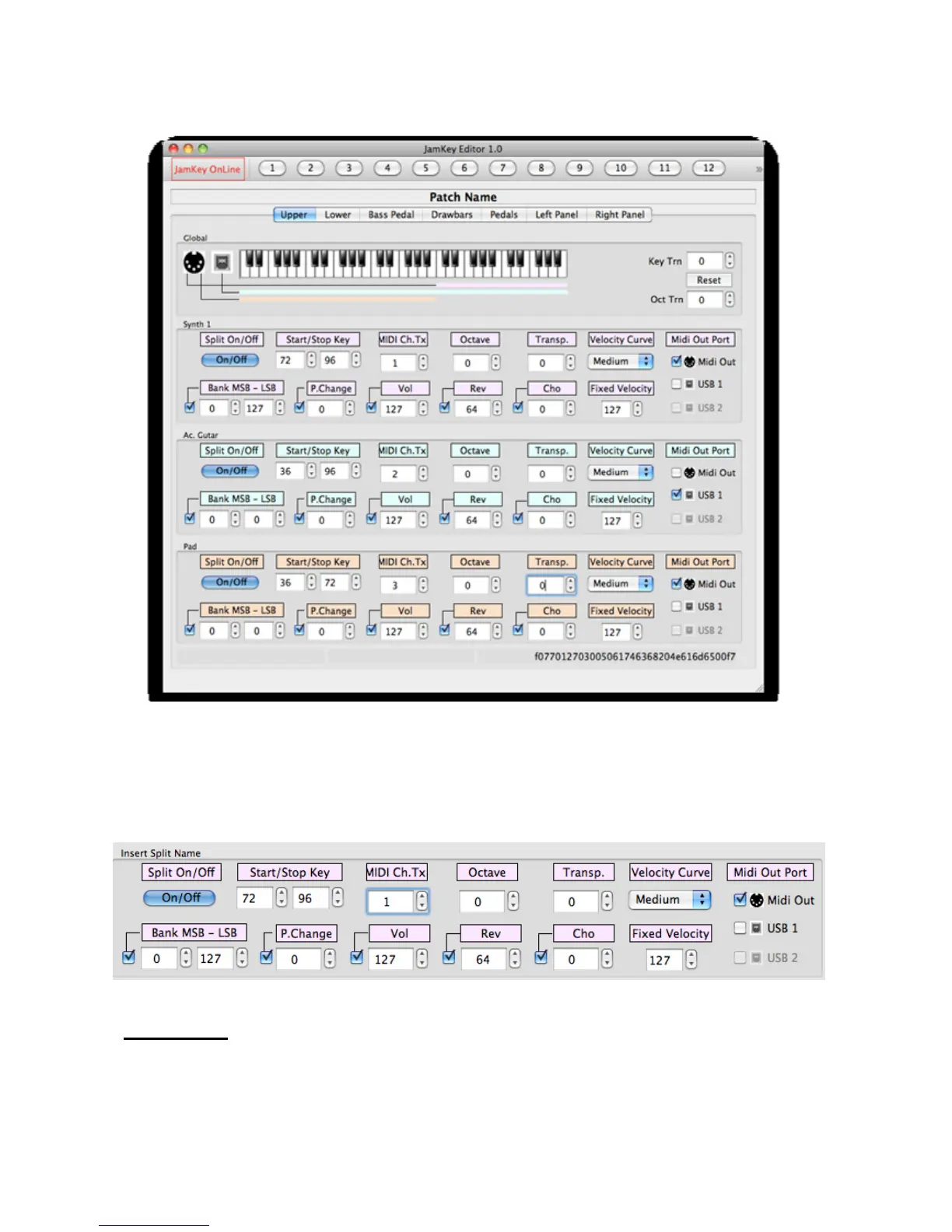 edited: Split Name, Split ON/OFF, Start/Stop Key, Midi Channel Transmit, Midi Channel