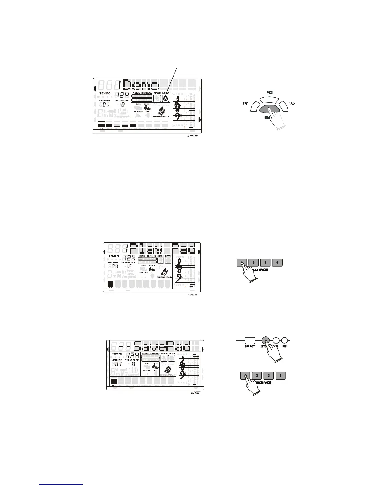 - Press DEMO/SONG button to start the DEMO. The name of the selected DEMO will appear