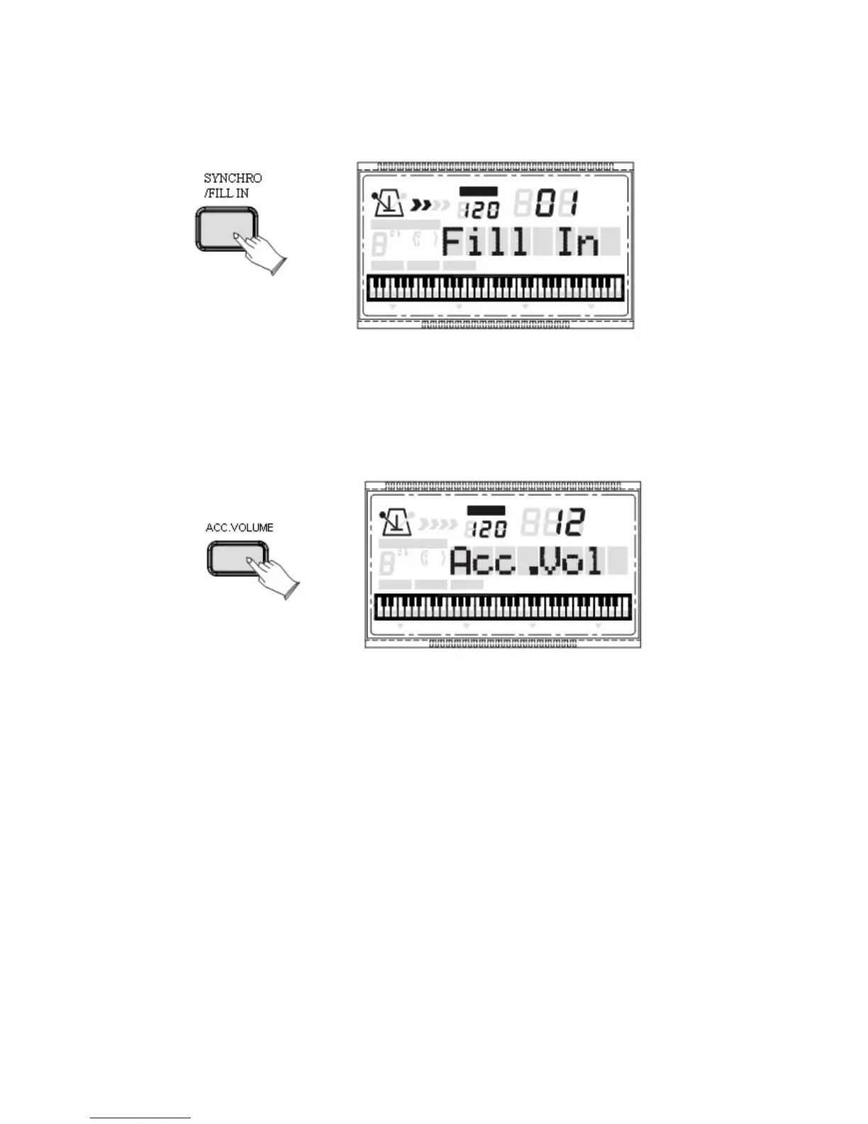Premere il tasto [ACC.VOLUME], il display LCD visualizzerà: Acc.Vol.