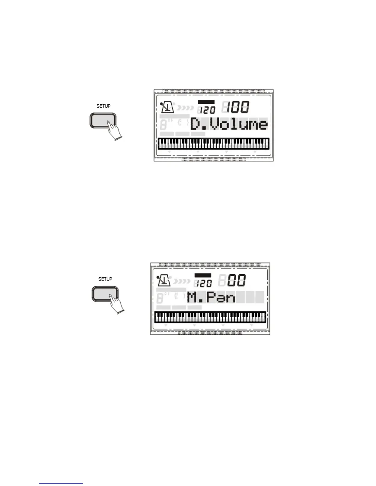 Premere il tasto [SETUP] per selezionare “D. Volume”, quindi usare i pulsanti [+] e [-]
