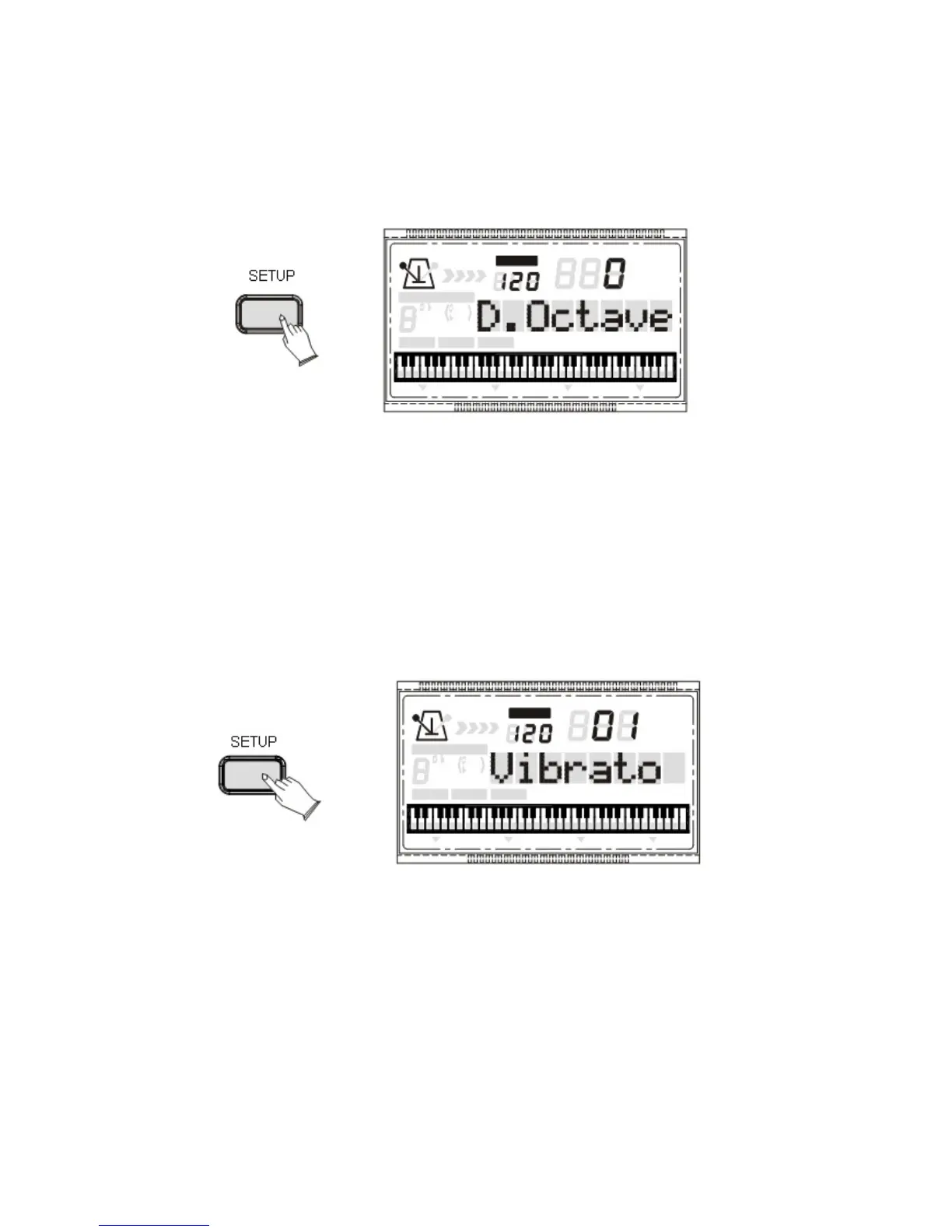 Premere il pulsante [SETUP] ripetutamente per selezionare Vibrato, quindi usare i pulsanti [+] e