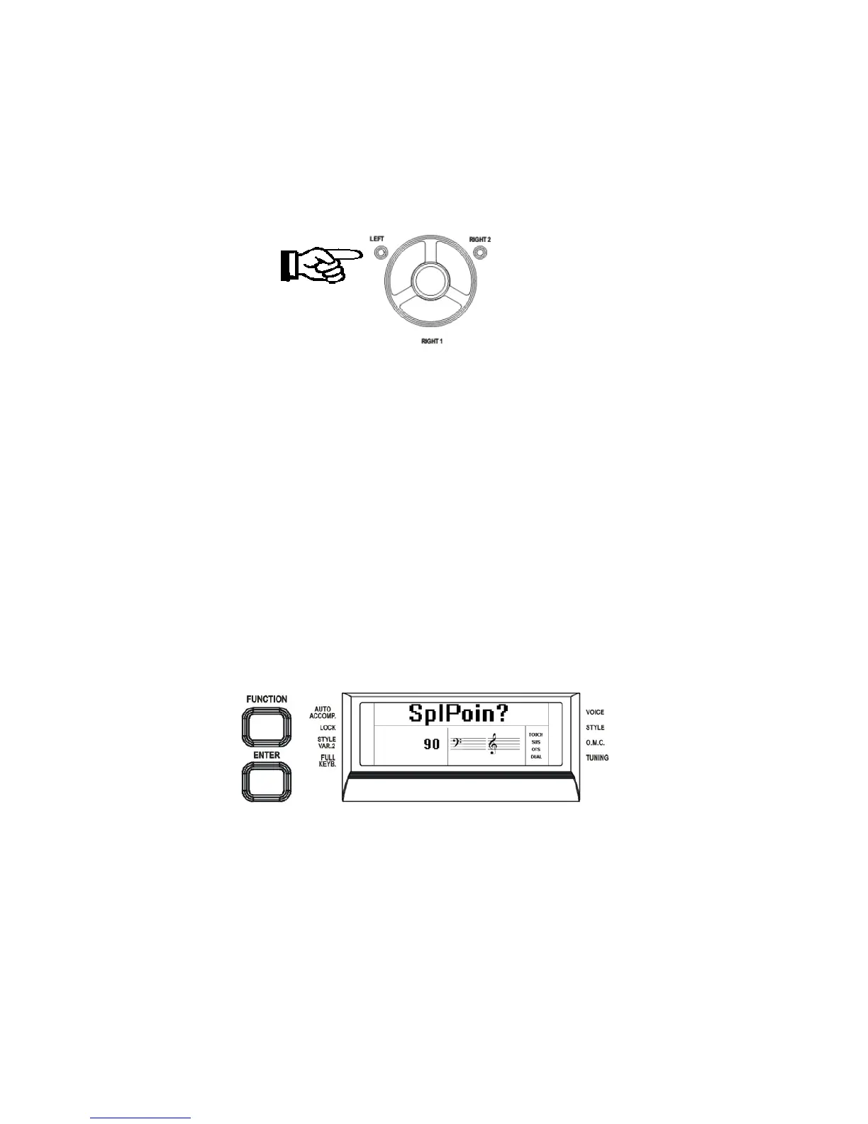 Press the [LEFT] buttons to select the LEFT voice. This will enter the instrument in SPLIT