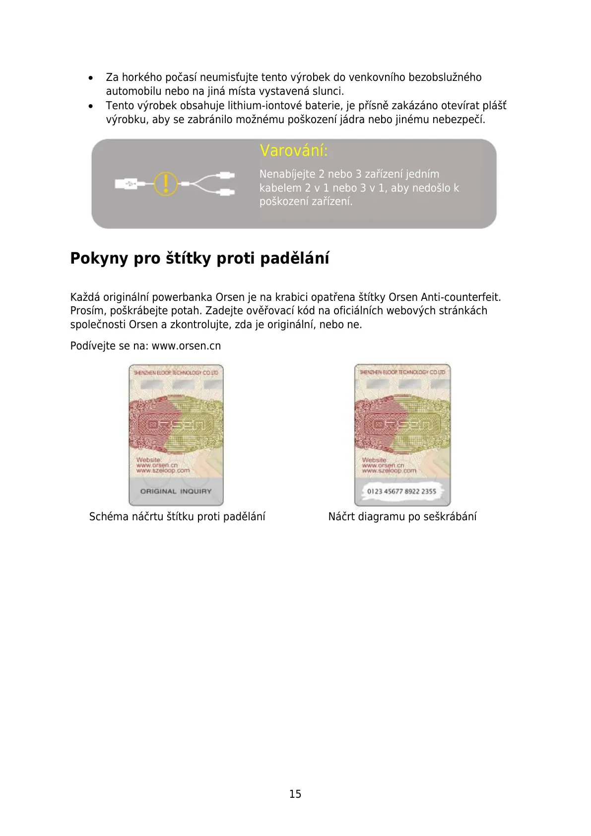 Každá originální powerbanka Orsen je na krabici opatřena štítky Orsen Anti-counterfeit.