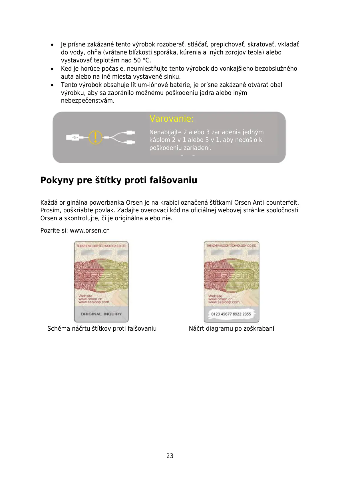 Každá originálna powerbanka Orsen je na krabici označená štítkami Orsen Anti-counterfeit.