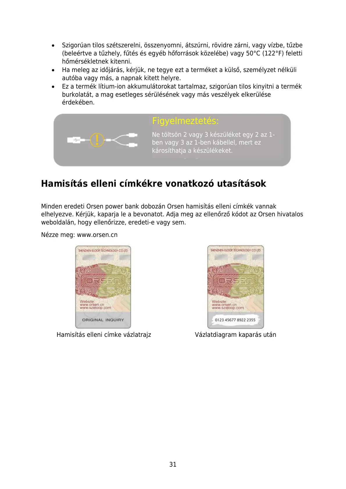 Minden eredeti Orsen power bank dobozán Orsen hamisítás elleni címkék vannak