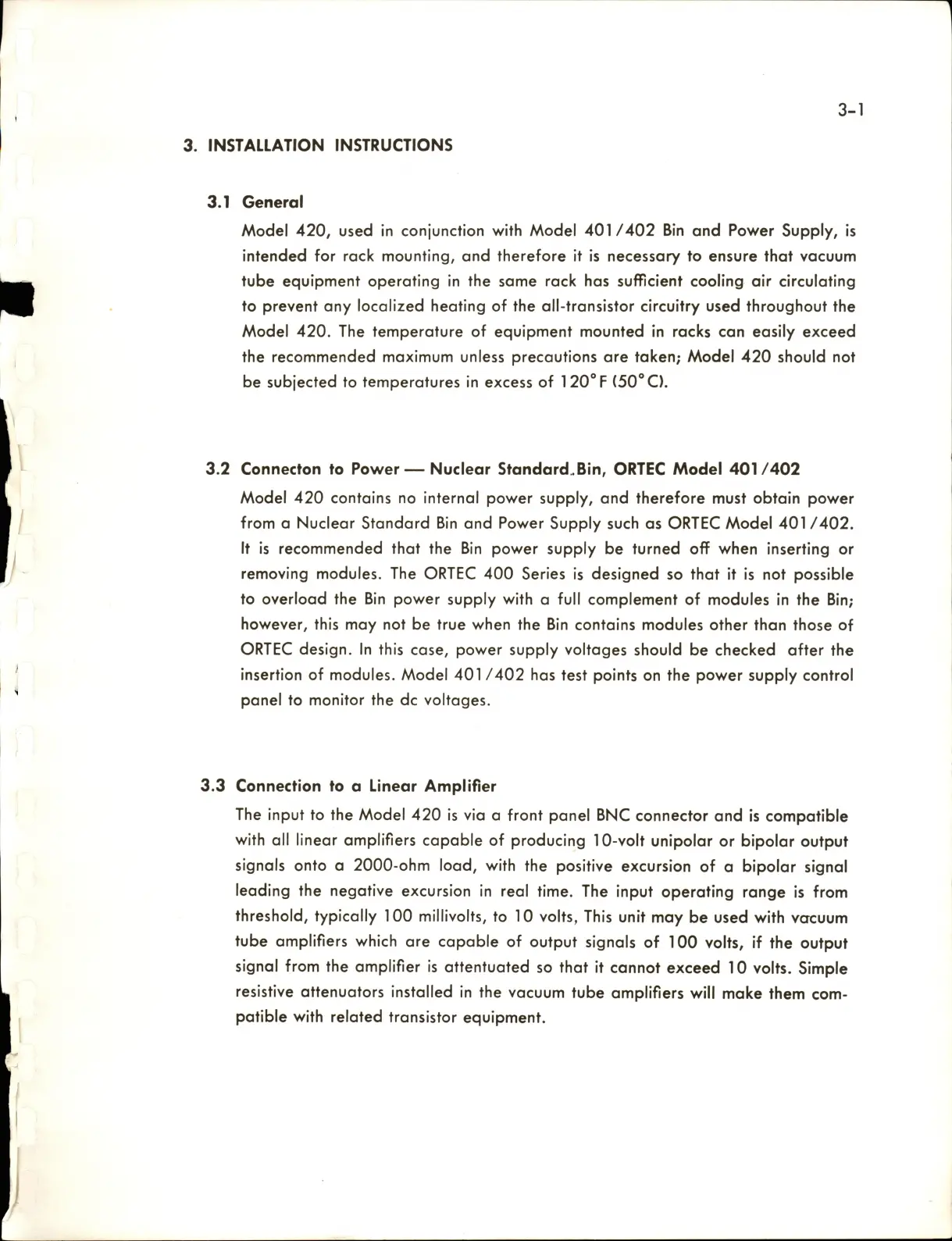ORTEC 420 - Installation Guide; General Installation Notes; Power Connection for ORTEC Bin; Linear Amplifier Connectivity