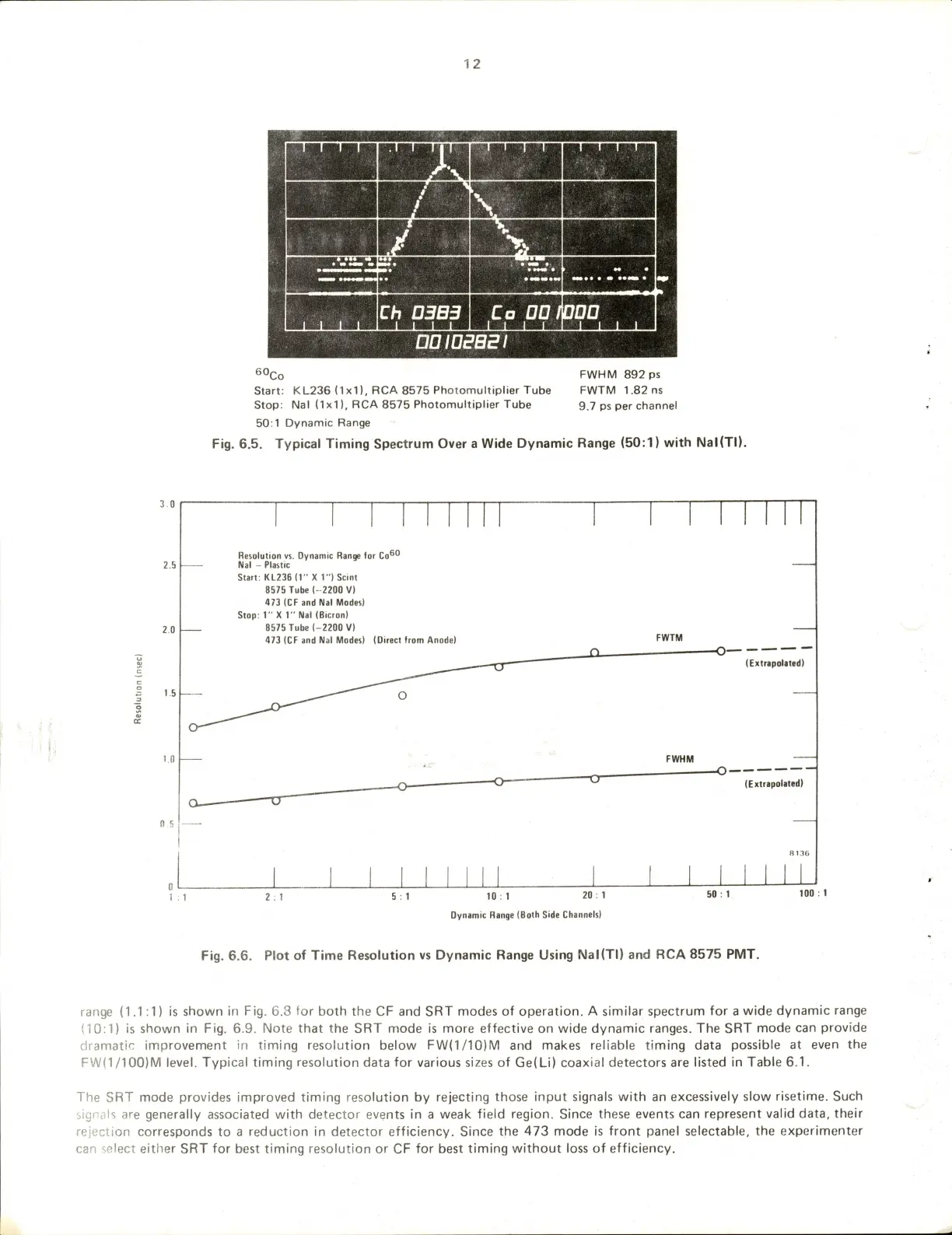 ORTEC 473 - Fig. 6.5. Typical Timing Spectrum over a Wide Dynamic Range (50:1) with Nal(TI); Fig. 6.6. Plot of Time Resolution Vs Dynamic Range Using Nal(TI) and RCA 8575 PMT