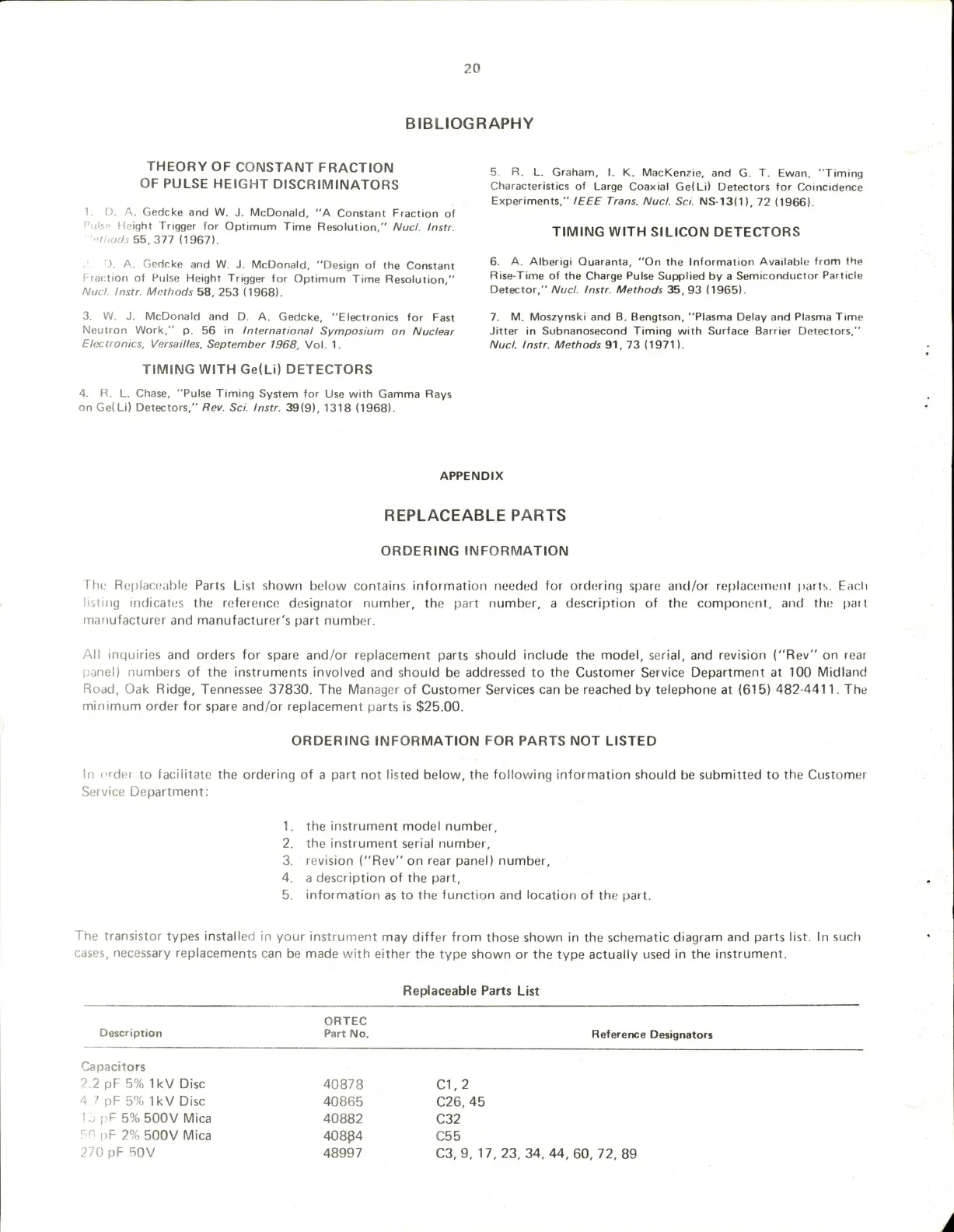 ORTEC 473 - Bibliography; Appendix; Replaceable Parts