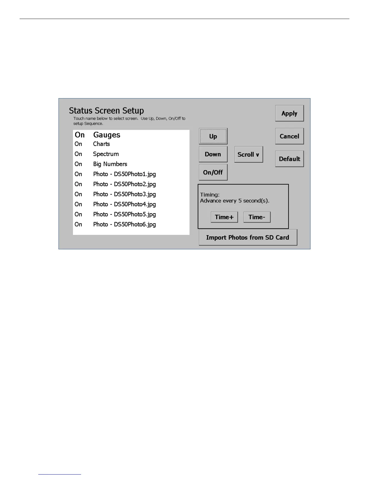 you to display or hide the four data display screens and up to nine .JPG-format images of your