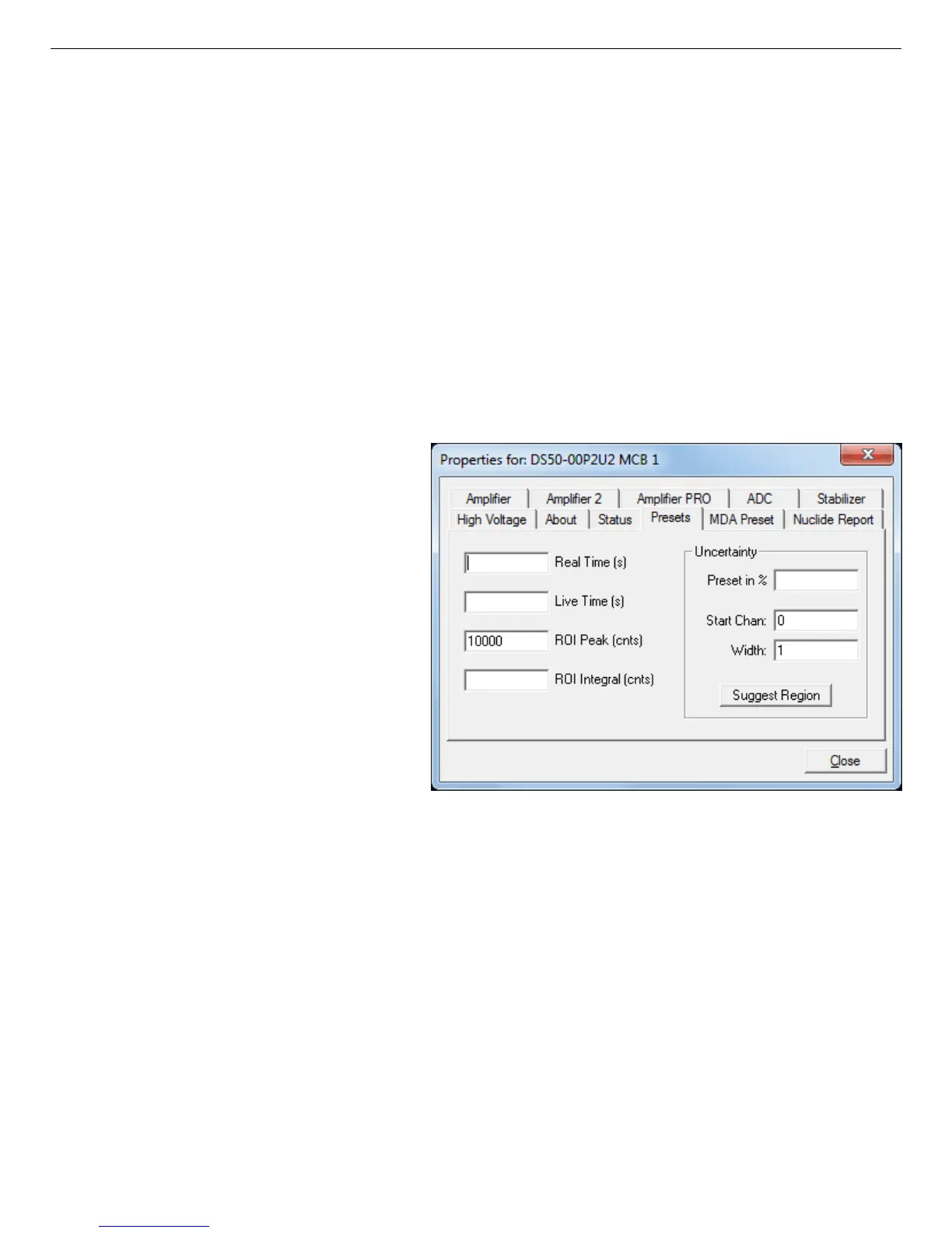 Enter the ROI Peak count preset value in counts. With this preset condition, the MCB stops