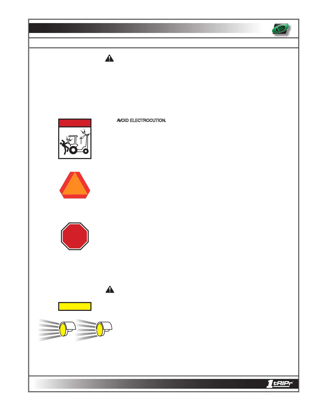• Make sure a slow moving vehicle (SMV) placard is mounted to the implement and is