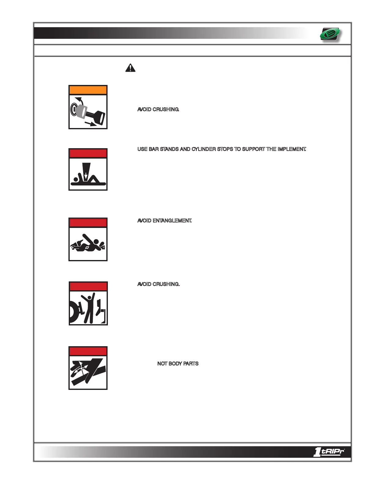 AVOID CRUSHING. Make sure all personnel are clear of the implement. Lower implement