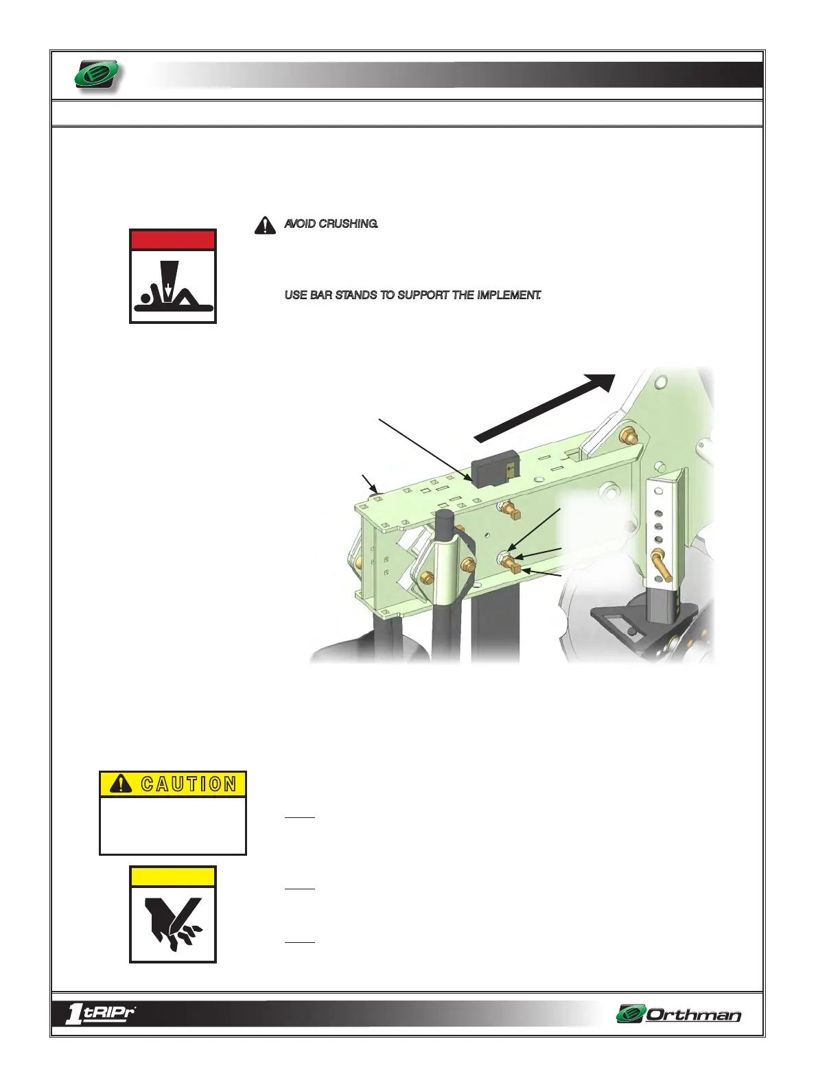 AVOID CRUSHING. Make sure all personnel are clear of the implement. Lower implement