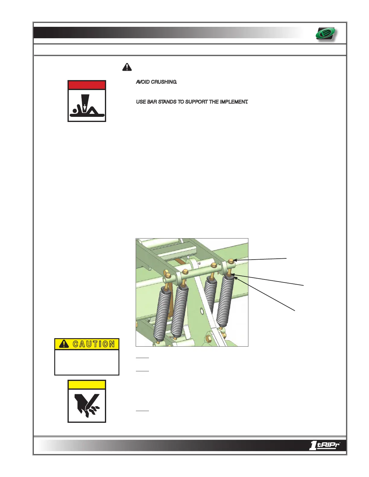 AVOID CRUSHING. Make sure all personnel are clear of the implement. Lower implement