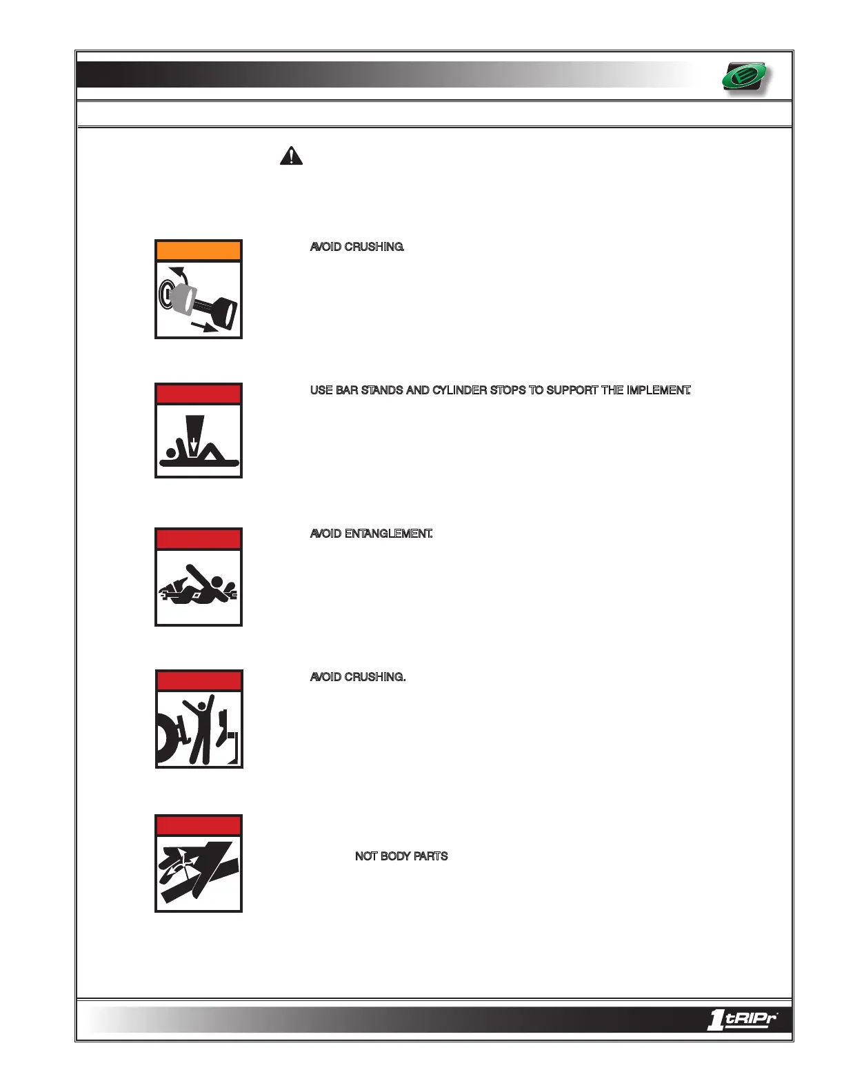 AVOID CRUSHING. Make sure all personnel are clear of the implement. Lower implement