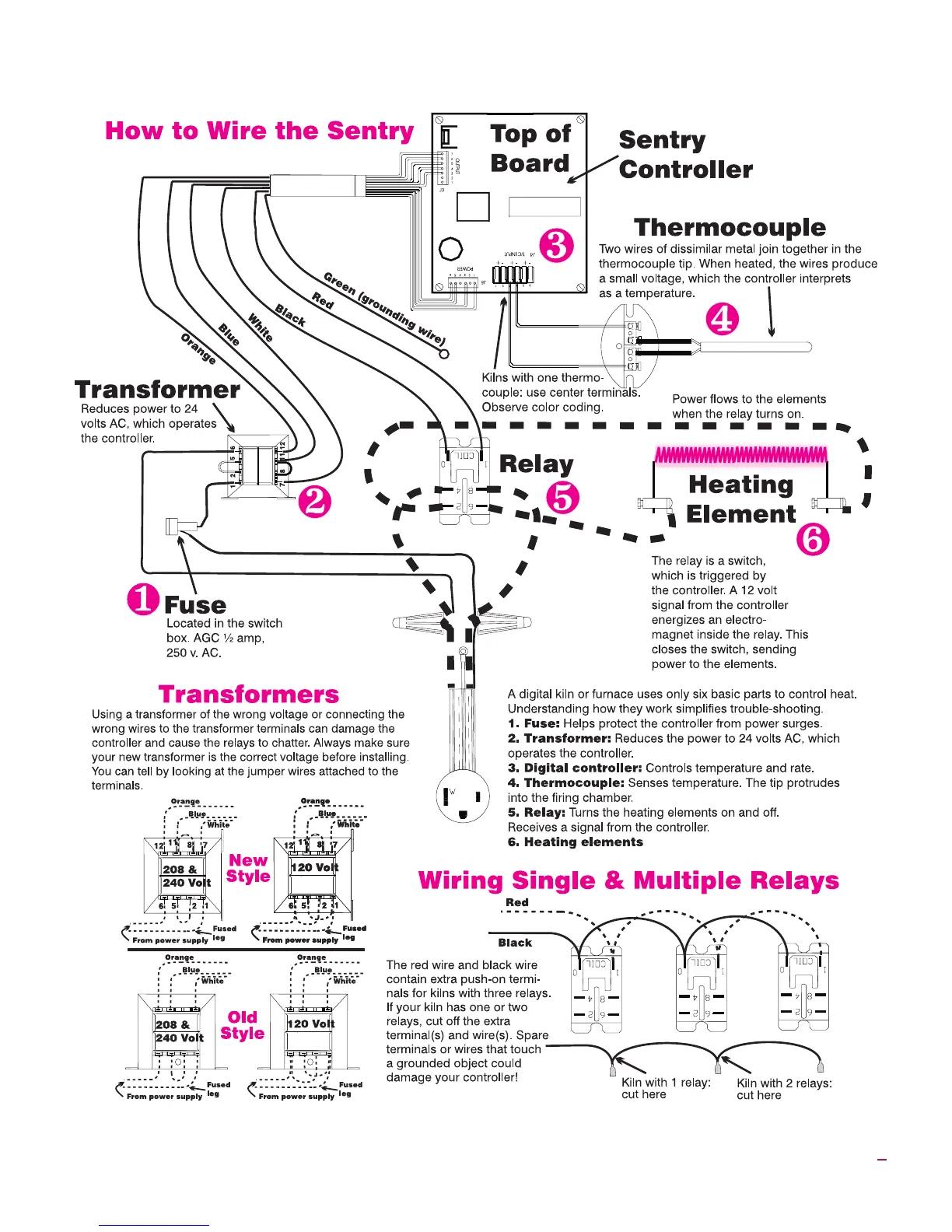 Orton Sentry 2.0 - Wiring the Sentry Controller; Sentry Controller Component Overview; Single and Multiple Relay Wiring Diagrams