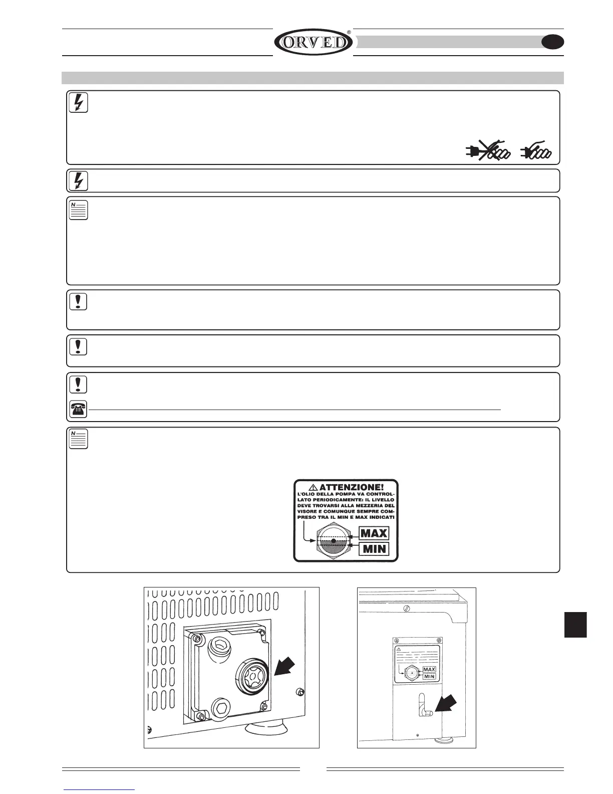 AVVERTENZA! L’olio della pompa va controllato ad ogni utilizzo della macchina attraverso il vetrino spia posto sul fianco o sul