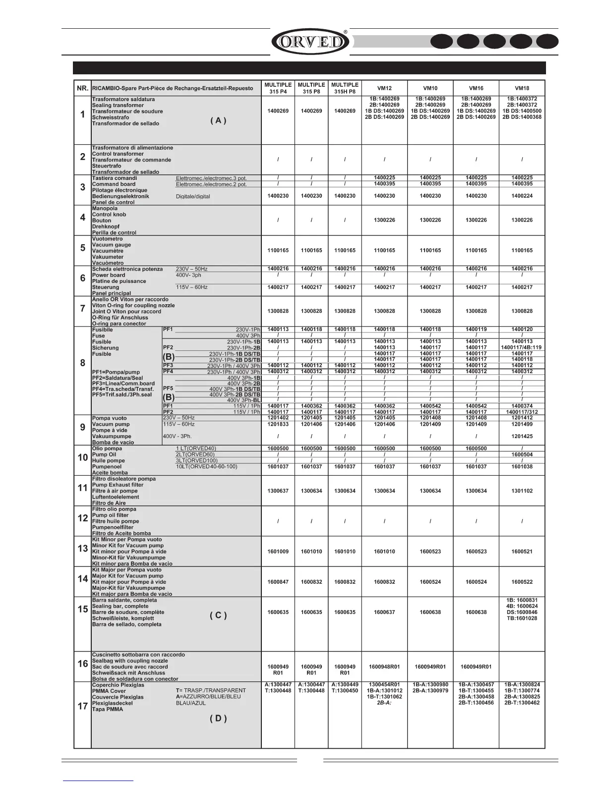 Orved VM12 - Spare Parts List; Spare Parts List (Part 1); Spare Parts List (Part 2)