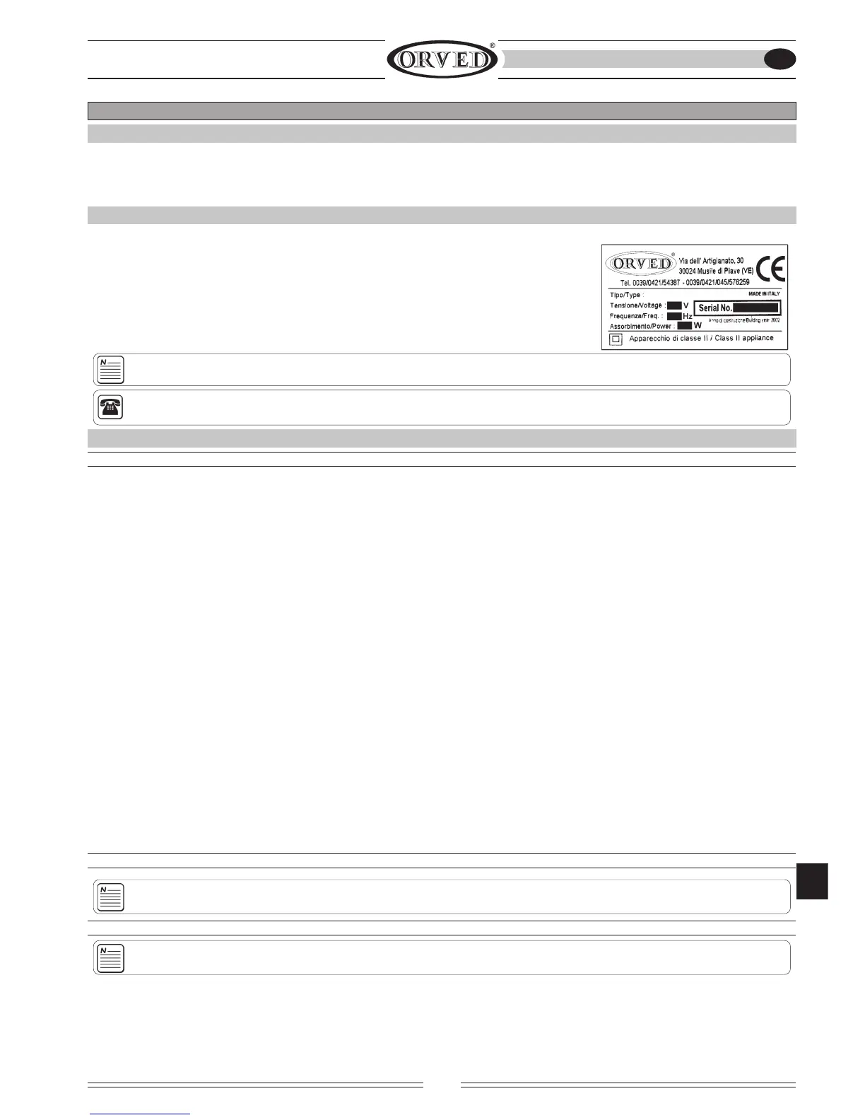 o di sue parti, oltre che portare alla cessazione della garanzia, solleva la ORVED da qualsiasi danno riportato a persone, animali o cose.