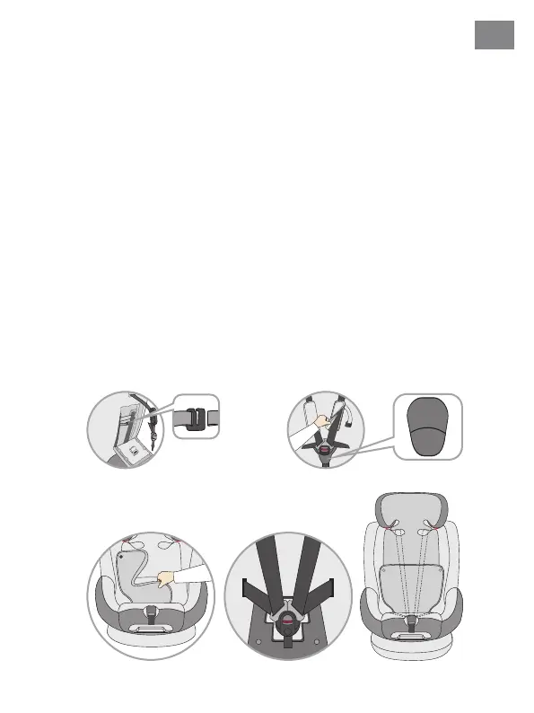 • Öffnen Sie das Gurtsystem und bringen Sie die Schultergurte hinter den Bezug.