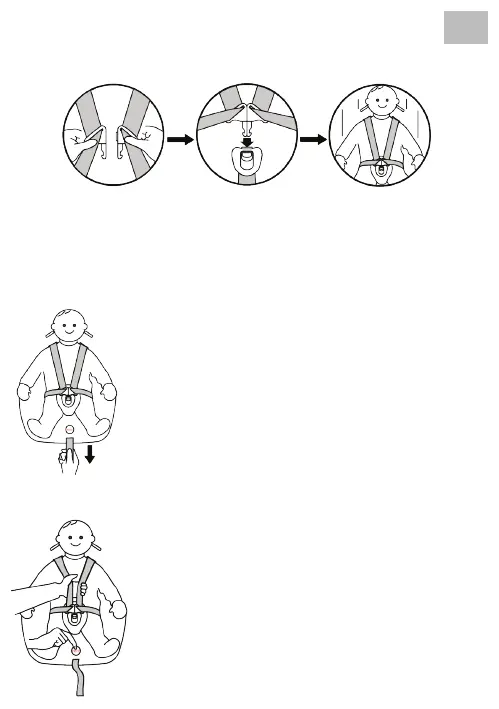 4. To release the harness, press the red buon on the buckle downwards.