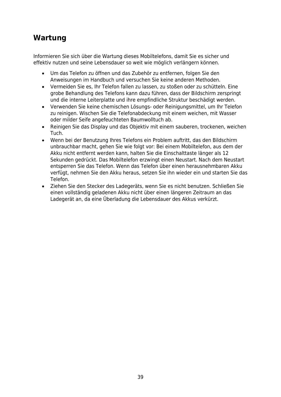 Informieren Sie sich über die Wartung dieses Mobiltelefons, damit Sie es sicher und