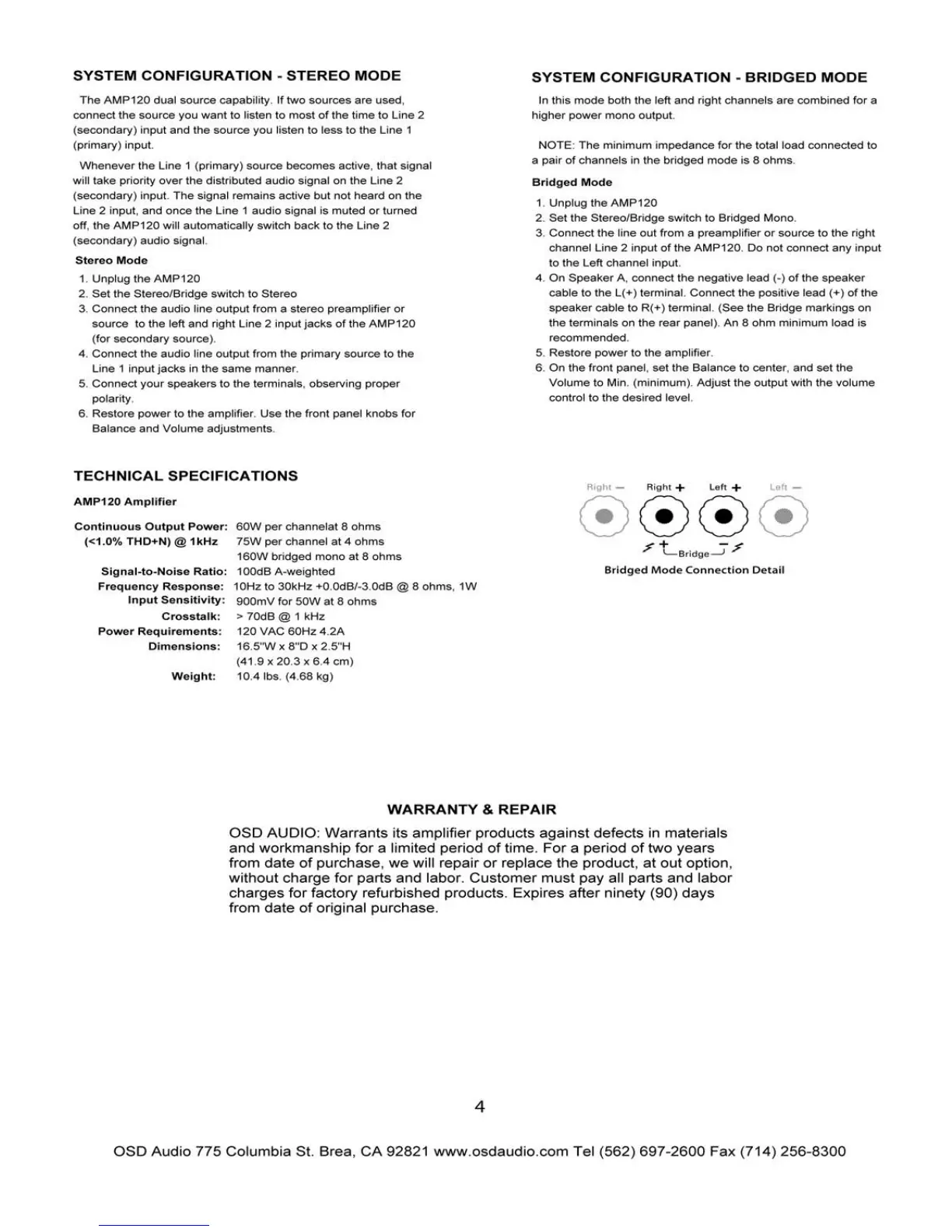 OSD Audio AMP120 - System Configuration; Stereo Mode Setup; Bridged Mode Setup; Technical Specifications and Warranty
