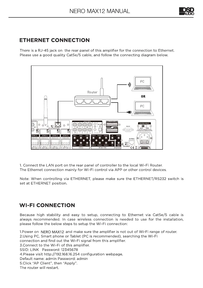 OSD Audio NERO MAX12 - Network Connection Methods; Ethernet Network Connection; Wi-Fi Wireless Connection